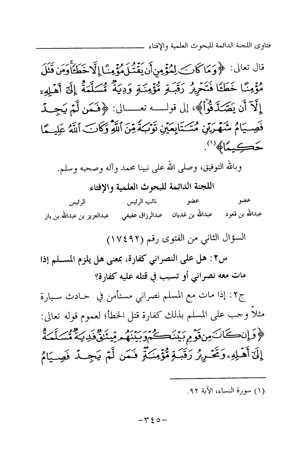 س2: هل على النصراني كفارة، بمعنى هل يلزم المسلم إذا مات معه نصراني أو تسبب في قتله عليه كفارة؟