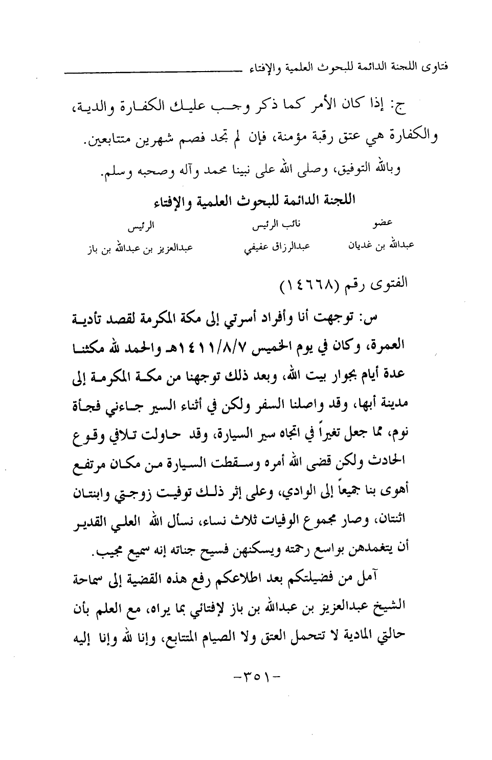 س: توجهت أنا وأفراد أسرتي إلى مكة المكرمة لقصد تأدية العمرة، وكان في يوم الخميس 7 \ 8 \ 1411هـ والحمد لله مكثنا عدة أيام بجوار بيت الله، وبعد ذلك توجهنا من مكة المكرمة إلى مدينة أبها، وقد واصلنا السفر ولكن في أثناء السير جاءني فجأة نوم، مما جعل تغيرا في اتجاه سير السيارة، وقد حاولت تلافي وقوع الحادث ولكن قضى الله أمره وسقطت السيارة من مكان مرتفع أهوى بنا جميعا إلى الوادي، وعلى إثر ذلك توفيت زوجتي وابنتان اثنتان، وصار مجموع الوفيات ثلاث نساء، نسأل الله العلي القدير أن يتغمدهن بواسع رحمته ويسكنهن فسيح جناته إنه سميع مجيب.