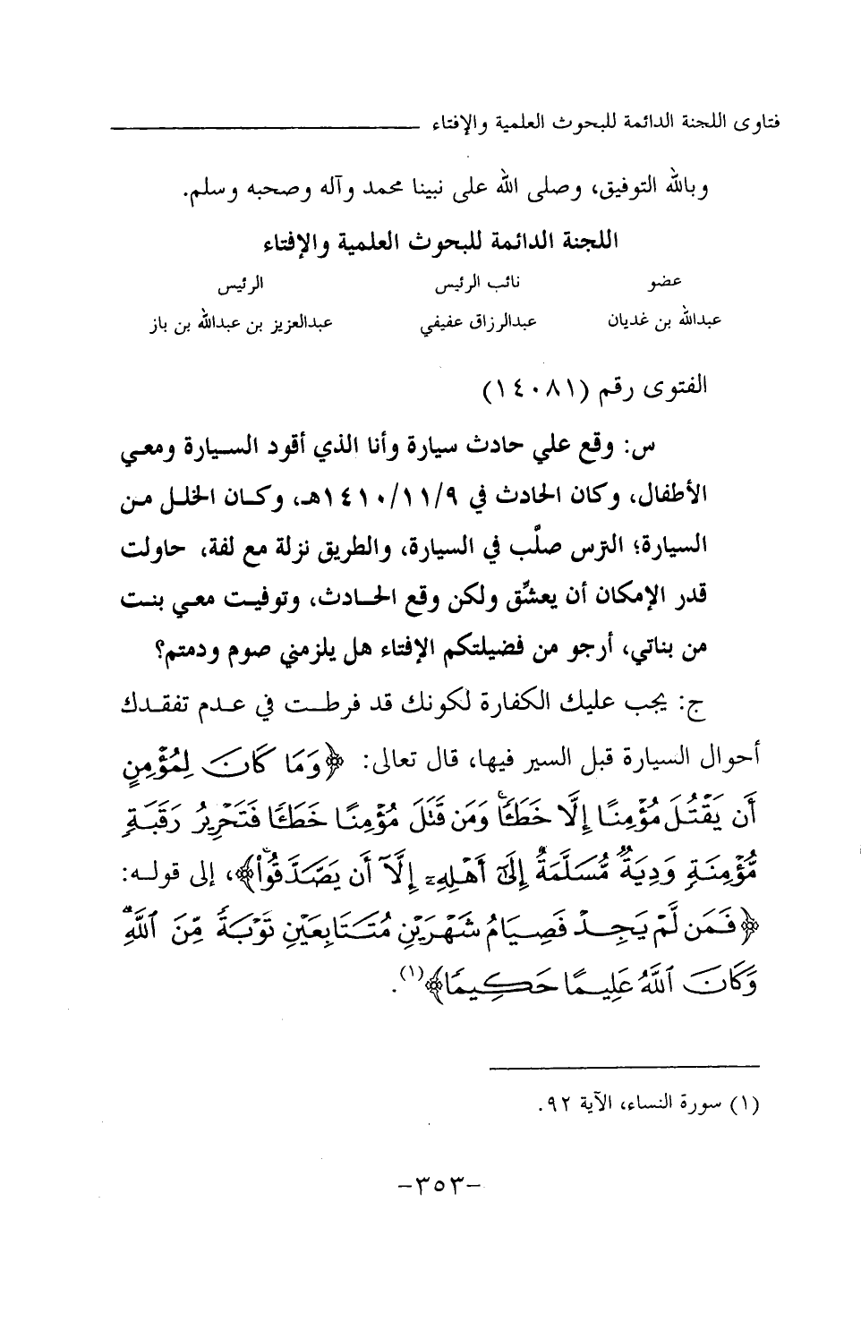 س: وقع علي حادث سيارة وأنا الذي أقود السيارة ومعي الأطفال، وكان الحادث في 9 \ 11 \ 1410 هـ، وكان الخلل من السيارة؛ الترس صلب في السيارة، والطريق نزلة مع لفة، حاولت قدر الإمكان أن يعشق ولكن وقع الحادث، وتوفيت معي بنت من بناتي، أرجو من فضيلتكم الإفتاء هل يلزمني صوم ودمتم؟