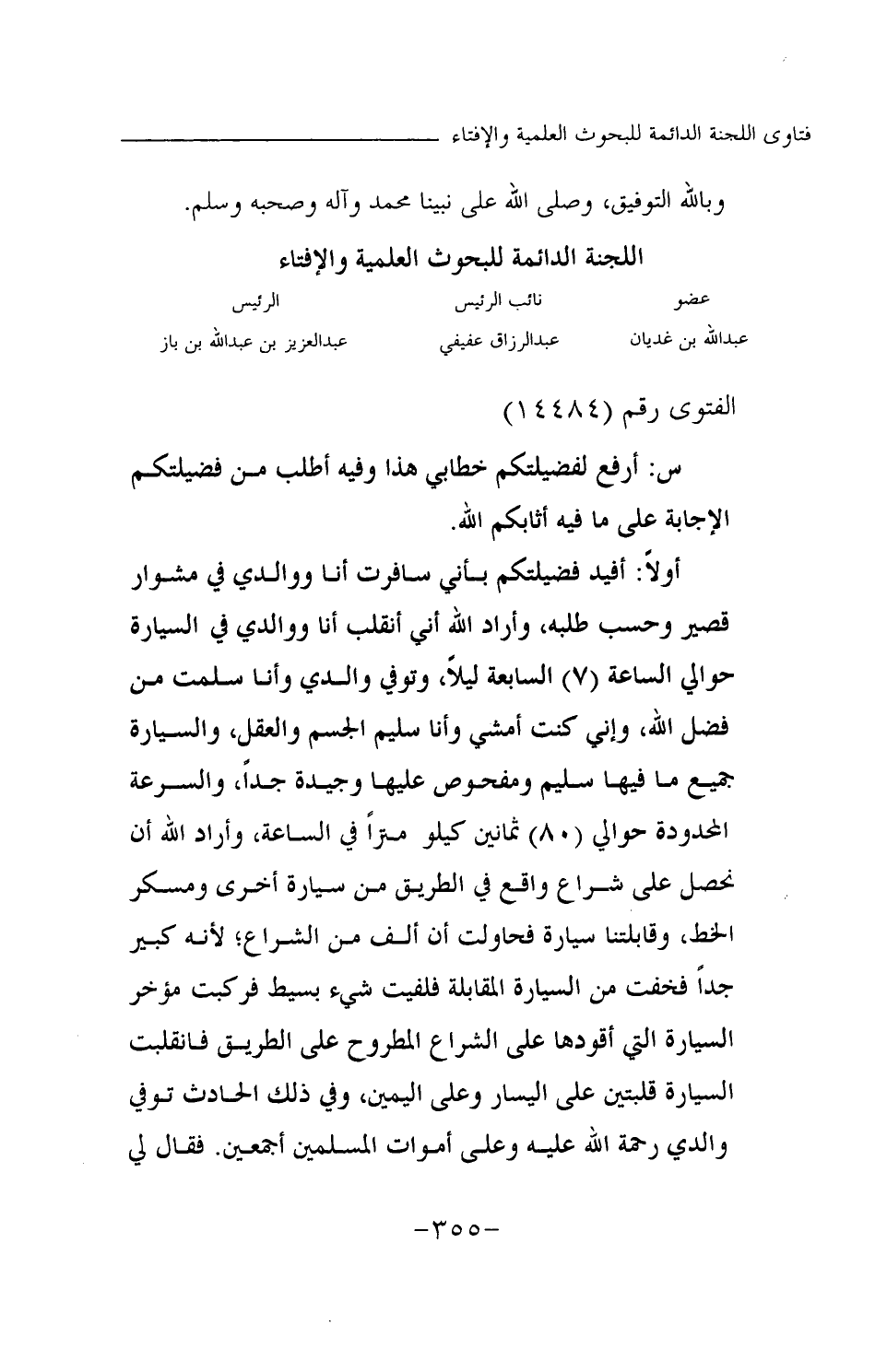 أولا: أفيد فضيلتكم بأني سافرت أنا ووالدي في مشوار قصر وحسب طلبه، وأراد الله أني أنقلب أنا ووالدي في السيارة حوالي الساعة (7) السابعة ليلا، وتوفي والدي وأنا سلمت من فضل الله، وإني كنت أمشي وأنا سليم الجسم والعقل، والسيارة جميع ما فيها سليم ومفحوص عليها وجيدة جدا، والسرعة المحدودة حوالي (80) ثمانين كيلو مترا في الساعة، وأراد الله أن نحصل على شراع واقع في الطريق من سيارة أخرى ومسكر الخط، وقابلتني سيارة فحاولت أن ألف من الشراع؛ لأنه كبير جدا فخفت من السيارة المقابلة فلفيت شيء بسيط فركبت مؤخر السيارة التي أقودها على الشراع المطروح على الطريق فانقلبت السيارة قلبتين على اليسار وعلى اليمين، وفي ذلك الحادث توفي والدي رحمة الله عليه وعلى أموات المسلمين أجمعين. فقال لي