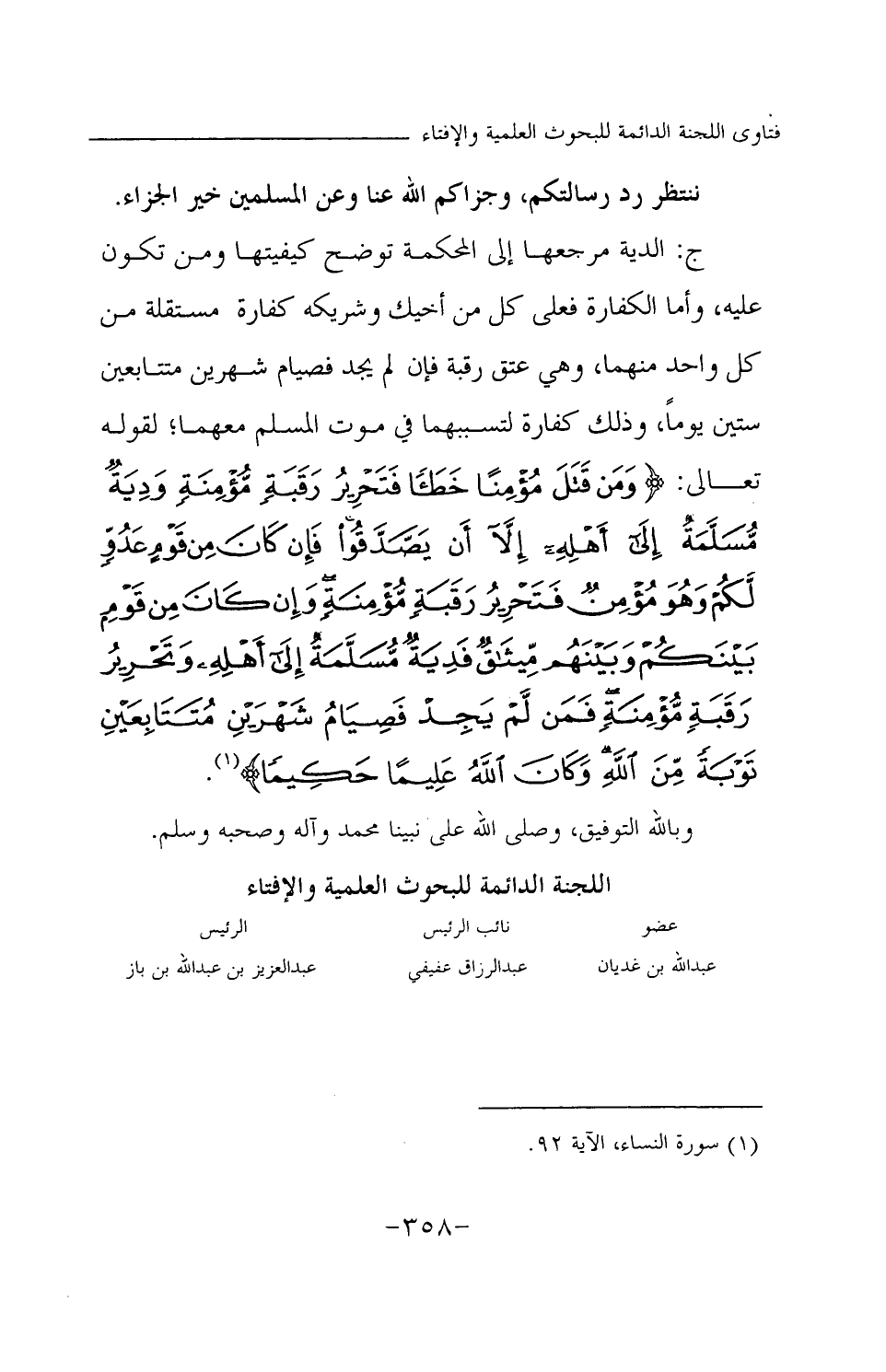 ج: الدية مرجعها إلى المحكمة توضح كيفيتها ومن تكون عليه، وأما الكفارة فعلى كل من أخيك وشريكه كفارة مستقلة من كل واحد منهما، وهي عتق رقبة فإن لم يجد فصيام شهرين متتابعين ستين يوما، وذلك كفارة لتسببهما في موت المسلم معهما، لقوله تعالى: {وَمَا كَانَ لِمُؤْمِنٍ أَنْ يَقْتُلَ مُؤْمِنًا إِلَّا خَطَأً وَمَنْ قَتَلَ مُؤْمِنًا خَطَأً فَتَحْرِيرُ رَقَبَةٍ مُؤْمِنَةٍ وَدِيَةٌ مُسَلَّمَةٌ إِلَى أَهْلِهِ إِلَّا أَنْ يَصَّدَّقُوا فَإِنْ كَانَ مِنْ قَوْمٍ عَدُوٍّ لَكُمْ وَهُوَ مُؤْمِنٌ فَتَحْرِيرُ رَقَبَةٍ مُؤْمِنَةٍ وَإِنْ كَانَ مِنْ قَوْمٍ بَيْنَكُمْ وَبَيْنَهُمْ مِيثَاقٌ فَدِيَةٌ مُسَلَّمَةٌ إِلَى أَهْلِهِ وَتَحْرِيرُ رَقَبَةٍ مُؤْمِنَةٍ فَمَنْ لَمْ يَجِدْ فَصِيَامُ شَهْرَيْنِ مُتَتَابِعَيْنِ تَوْبَةً مِنَ اللَّهِ وَكَانَ اللَّهُ عَلِيمًا حَكِيمًا} (¬1)