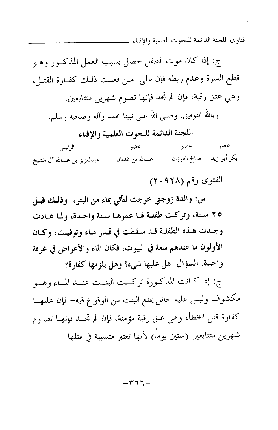 س: والدة زوجتي خرجت لتأتي بماء من البئر، وذلك قبل 25 سنة، وتركت طفلة لها عمرها سنة واحدة، ولما عادت وجدت هذه الطفلة قد سقطت في قدر ماء وتوفيت، وكان الأولون ما عندهم سعة في البيوت، فكان الماء والأغراض في غرفة واحدة. السؤال: هل عليها شيء؟ وهل يلزمها كفارة؟