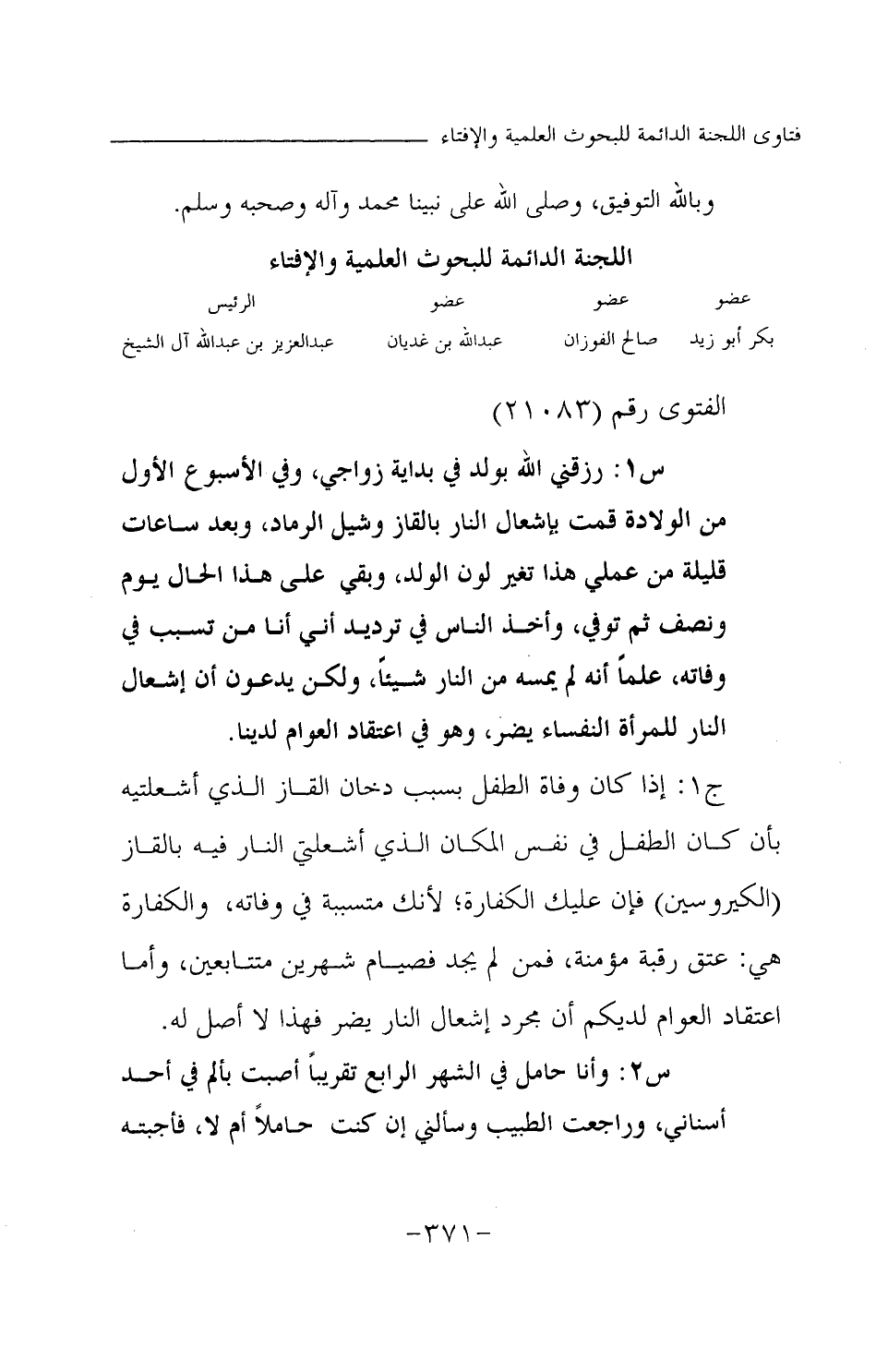 ج:1 إذا كان وفاة الطفل بسب دخان القاز الذي أشعلتيه بأن كان الطفل في نفس المكان الذي أشعلتي النار فيه بالقاز (الكيروسين) فإن عليك الكفارة؛ لأنك متسببة في وفاته، والكفارة هي: عتق رقبة مؤمنة، فمن لم يجد فصيام شهرين متتابعين، وأما اعتقاد العوام لديكم أن مجرد إشعال النار يضر فهذا لا أصل له.