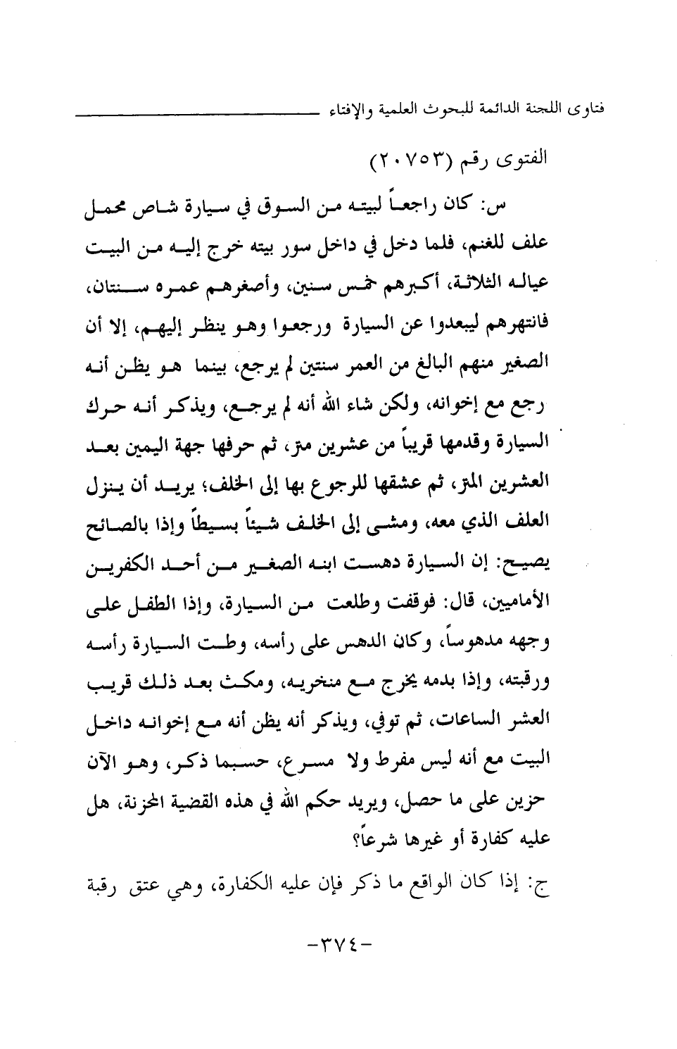 س: كان راجعا لبيته من السوق في سيارة شاص محمل علف للغنم، فلما دخل في داخل سور بيته خرج إليه من البيت عياله الثلاثة، أكبرهم خمس سنين، وأصغرهم عمره سنتان، فانتهرهم ليبعدوا عن السيارة ورجعوا وهو ينظر إليهم، إلا أن الصغير منهم البالغ من العمر سنتان لم يرجع، بينما هو يظن أنه رجع مع إخوانه، ولكن شاء الله أنه لم يرجع، ويذكر أنه حرك السيارة وقدمها قريبا من عشرين متر، ثم حرفها جهة اليمين بعد العشرين المتر، ثم عشقها للرجوع بها إلى الخلف؛ يريد أن ينزل العلف الذي معه، ومشى إلى الحلف شيئا بسيط وإذا بالصائح يصيح: إن السيارة دهست ابنه الصغير من أحد الكفرين الأماميين، قال: فوقفت وطلعت من السيارة، وإذا الطفل على وجهه مدهوسا، وكان الدهس على رأسه، وطت السيارة رأسه ورقبته، وإذا بدمه يخرج مع منخريه، ومكث بعد ذلك قريب العشر الساعات، ثم توفي، ويذكر أنه يظن أنه مع إخوانه داخل البيت مع أنه ليس مفرط ولا مسرع، حسبما ذكر، وهو الآن حزين على ما حصل، ويريد حكم الله في هذه القضية المحزنة، هل عليه كفارة أو غيرها شرعا؟