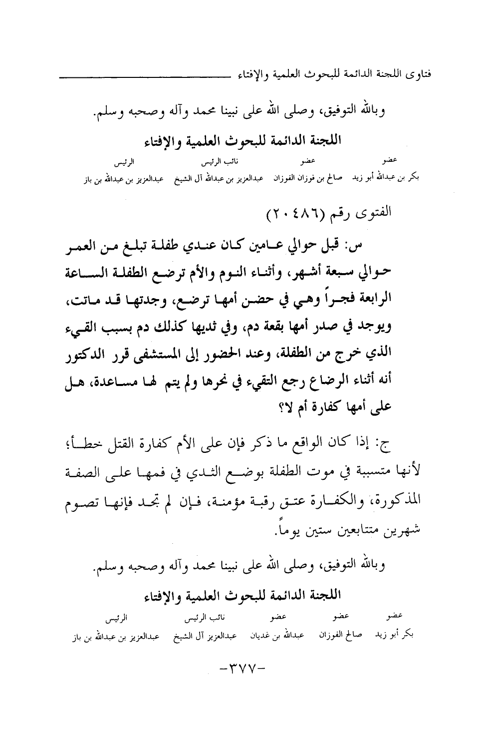 س: قبل حوالي عامين كان عندي طفلة تبلغ من العمر حوالي سبعة أشهر، وأثناء النوم والأم ترضع الطفلة الساعة الرابعة فجرا وهي في حضن أمها ترضع، وجدتها قد ماتت، ويوجد في صدر أمها بقعة دم، وفي ثديها كذلك دم بسب القيء الذي خرج من الطفلة، وعند الحضور إلى المستشفى قرر الدكتور أنه أثناء الرضاع رجع التقيء في نحرها ولم يتم لها مساعدة، هل على أمها كفارة أم لا؟