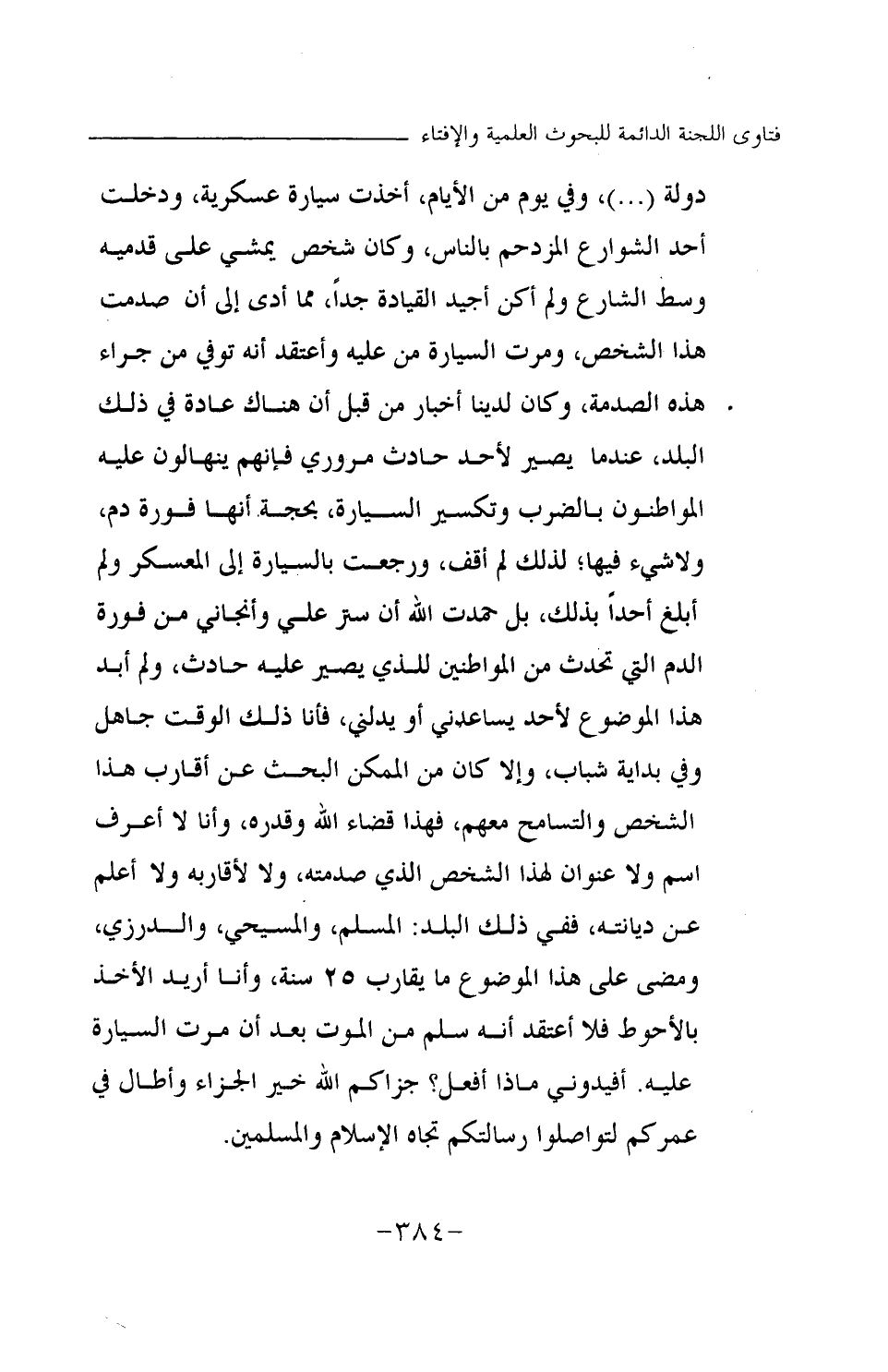دولة (. . .) ، وفي يوم من الأيام، أخذت سيارة عسكرية، ودخلت أحد الشوارع المزدحم بالناس، وكان شخص يمشي على قدميه وسط الشارع ولم أكن أجيد القيادة جدا، مما أدى إلى أن صدمت هذا الشخص، ومرت السيارة من عليه وأعتقد أنه توفي من جراء هذه الصدمة، وكان لدينا أخبار من قبل أن هناك عادة في ذلك البلد، عندما يصير لأحد حادث مروري فإنهم ينهالون عليه المواطنون بالضرب وتكسير السيارة، بحجة أنها فورة دم، ولا شيء فيها، لذلك لم أقف، ورجعت بالسيارة إلى المعسكر ولم أبلغ أحدا بذلك، بل حمدت الله أن ستر علي وأنجاني من فورة الدم التي تحدث من المواطنين للذي يصير عليه حادث، ولم أبد هذا الموضوع لأحد يساعدني أو يدلني، فأنا ذلك الوقت جاهل وفي بداية شباب، وإلا كان من الممكن البحث عن أقارب هذا الشخص والتسامح معهم، فهذا قضاء الله وقدره، وأنا لا أعرف اسم ولا عنوان لهذا الشخص الذي صدمته، ولا لأقاربه ولا أعلم عن ديانته، ففي ذلك البلد: المسلم، والمسيحي، والدرزي، ومضى على هذا الموضوع ما يقارب 25 سنة، وأنا أريد الأخذ بالأحوط فلا أعتقد أنه سلم من الموت بعد أن مرت السيارة عليه. أفيدوني ماذا أفعل؟ جزاكم الله نجير الجزاء وأطال في عمركم لتواصلوا رسالتكم تجاه الإسلام والمسلمين.