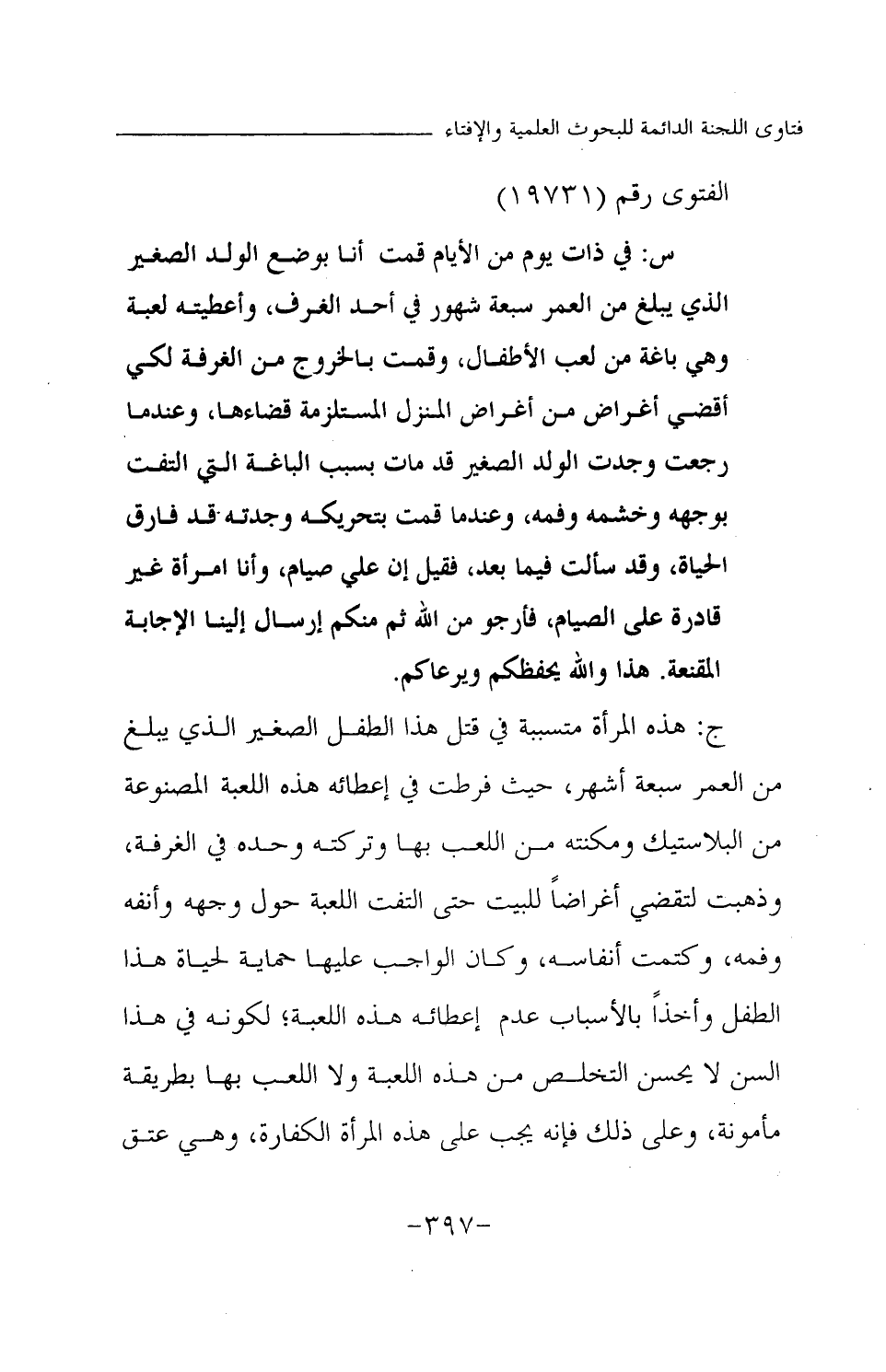 ج: هذه المرأة متسببة في قتل هذا الطفل الصغير الذي يبلغ من العمر سبعة أشهر، حيث فرطت في إعطائه هذه اللعبة المصنوعة من البلاستيك ومكنته من اللعب بها وتركته وحده في الغرفة؛ وذهبت لتقضي أغراضا للبيت حتى التفت اللعبة حول وجهه وأنفه وفمه، وكتمت أنفاسه، وكان الواجب عليها حماية لحياة هذا الطفل وأخذا بالأسباب عدم إعطائه هذه اللعبة، لكونه في هذا السن لا يحسن التخلص من هذه اللعبة ولا اللعب بها بطريقة مأمونة، وعلى ذلك فإنه يجب على هذه المرأة الكفارة، وهي عتق