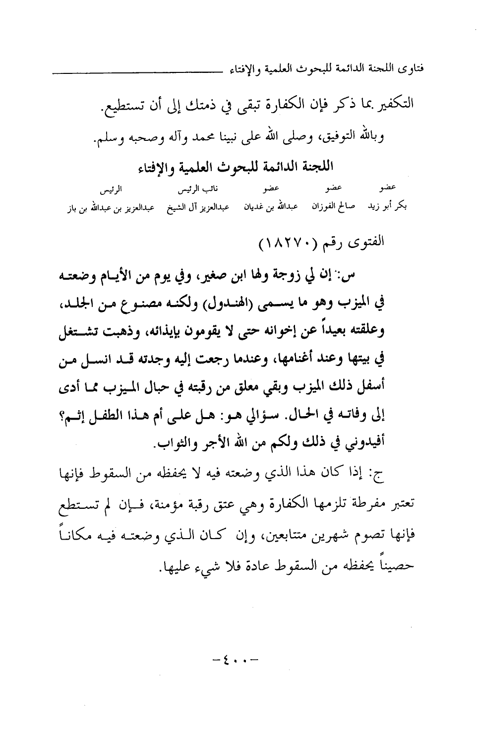 ج: إذا كان هذا الذي وضعته فيه لا يحفظه من السقوط فإنها تعتبر مفرطة تلزمها الكفارة وهي عتق رقبة مؤمنة، فإن لم تستطع فإنها تصوم شهرين متتابعين، وإن كان الذي وضعته فيه مكانا حصينا يحفظه من السقوط عادة فلا شيء عليها.