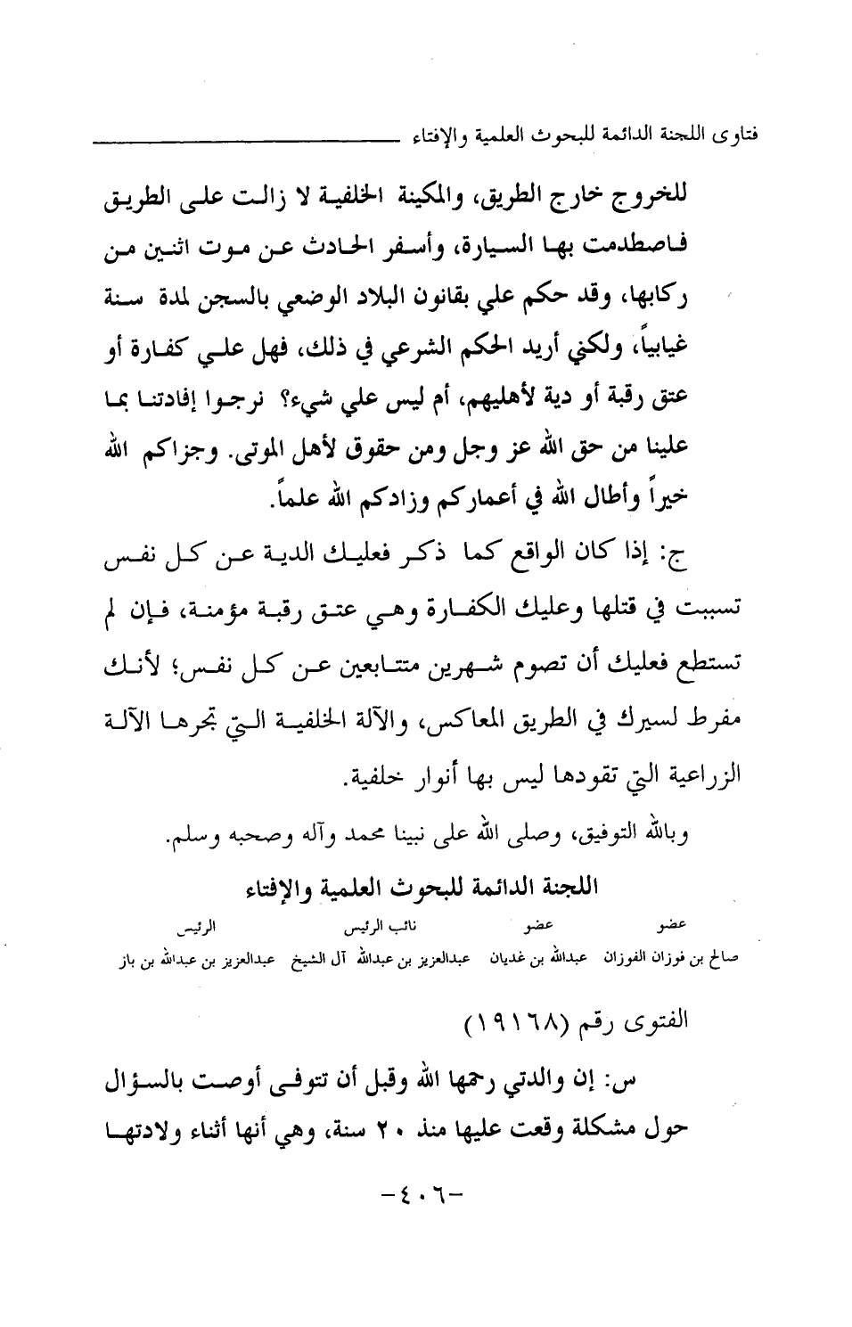 ج: إذا كان الواقع كما ذكر فعليك الدية عن كل نفس تسببت في قتلها وعليك الكفارة وهي عتق رقبة مؤمنة، فإن لم تستطع فعليك أن تصوم شهرين متتابعين عن كل نفس؛ لأنك مفرط لسيرك في الطريق المعاكس، والآلة الخلفية التي تجرها الآلة الزراعية التي تقودها ليس بها أنوار خلفية.