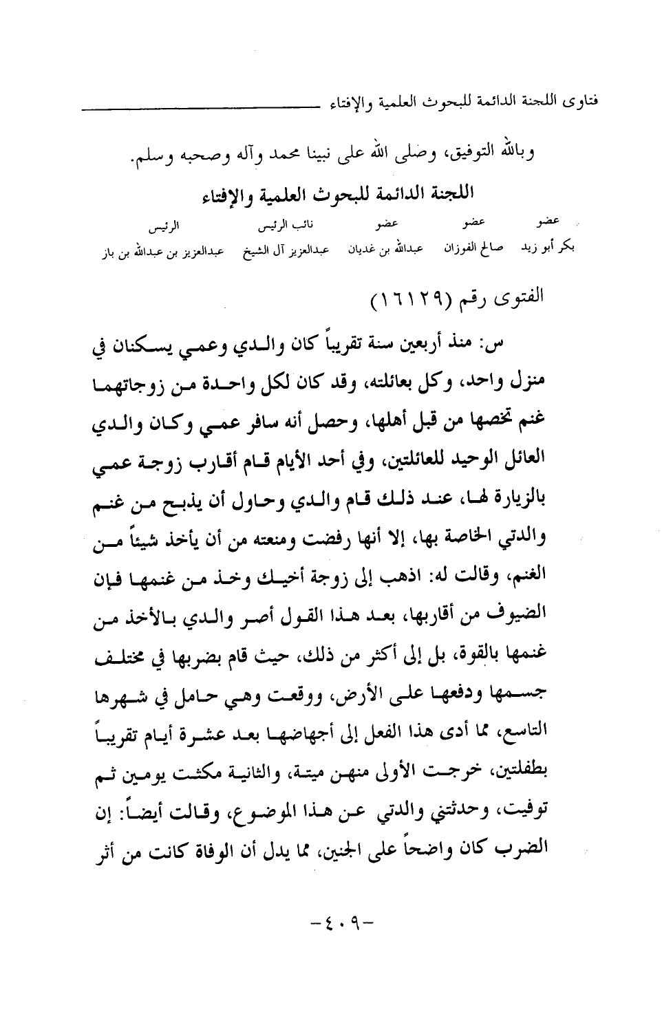 س: منذ أربعين سنة تقريبا كان والدي وعمي يسكنان في منزل واحد، وكل بعائلته، وقد كان لكل واحدة من زوجاتهما غنم تخصها من قبل أهلها، وحصل أنه سافر عمي وكان والدي العائل الوحيد للعائلتين، وفي أحد الأيام قام أقارب زوجة عمي بالزيارة لها، عند ذلك قام والدي وحاول أن يذبح من غنم والدتي الخاصة بها، إلا أنها رفضت ومنعته من أن يأخذ شيئا من الغنم، وقالت له: اذهب إلى زوجة أخيك وخذ من غنمها فإن الضيوف من أقاربها، بعد هذا القول أصر والدي بالأخذ من غنمها بالقوة، بل إلى أكثر من ذلك، حيث قام بضربها في مختلف جسمها ودفعها على الأرض، ووقعت وهي حامل في شهرها التاسع، مما أدى هذا الفعل إلى أجهاضها بعد عشرة أيام تقريبا بطفلتين، خرجت الأولى منهن ميتة، والثانية مكثت يومين ثم توفيت، وحدثتني والدتي عن هذا الموضوع، وقالت أيضا: إن الضرب كان واضحا على الجنين، مما يدل أن الوفاة كانت من أثر