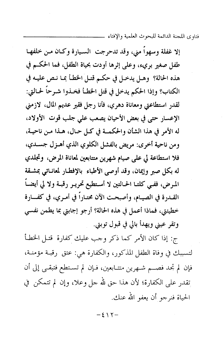 ج: إذا كان الأمر كما ذكر وجب عليك كفارة قتل الخطأ لتسببك في وفاة الطفل المذكور، والكفارة هي: عتق رقبة مؤمنة، فإن لم تجد فصم شهرين متتابعين، فإن لم تستطع فتبقى إلى أن تقدر على الكفارة؛ لأن هذا حق لله جل وعلا، وإن لم تتمكن في الحياة فنرجو أن يعفو الله عنك.