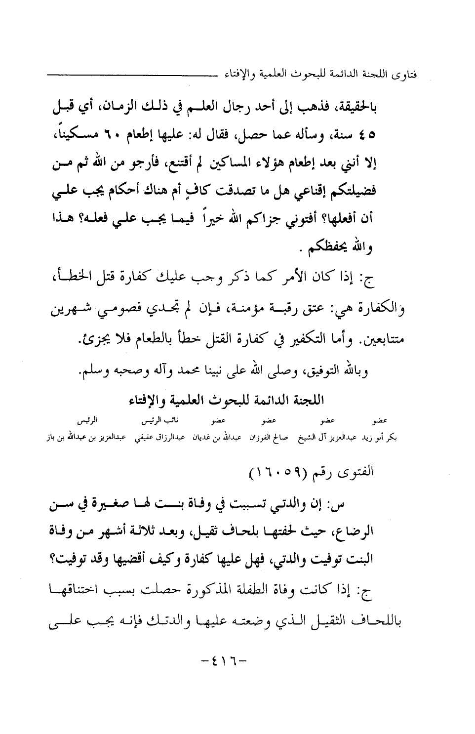 ج: إذا كانت وفاة الطفلة المذكورة حصلت بسبب اختناقها باللحاف الثقيل الذي وضعته عليها والدتك فإنه يجب على