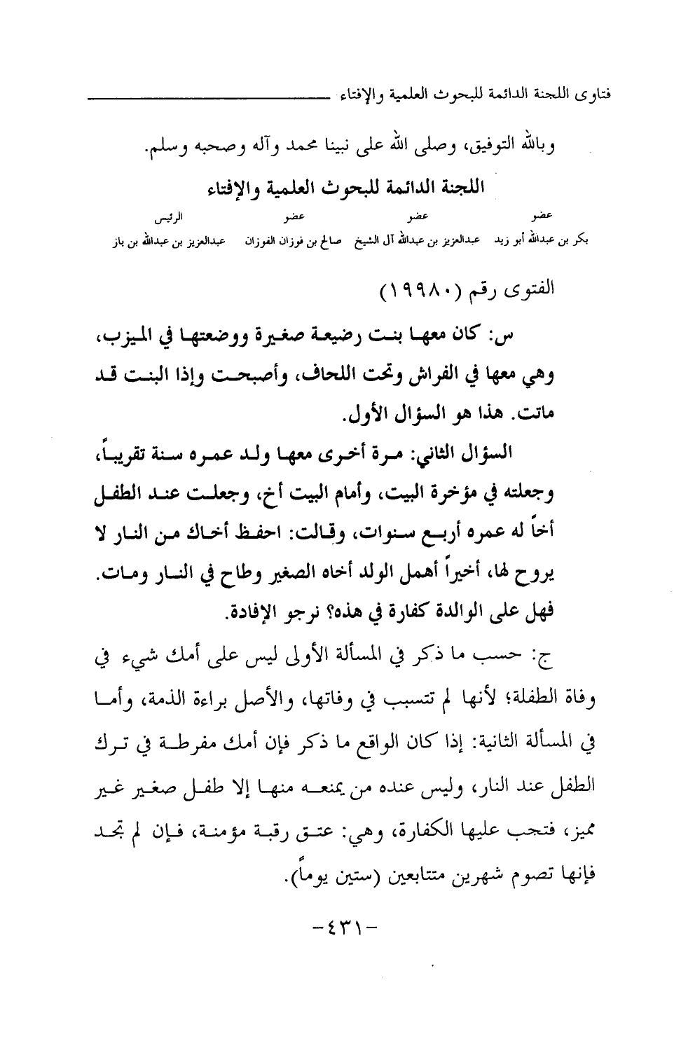 السؤال الثاني: مرة أخرى معها ولد عمره سنة تقريبا، وجعلته في مؤخرة البيت، وأمام البيت أخ، وجعلت عند الطفل أخا له عمره أربع سنوات، وقالت: احفظ أخاك من النار لا يروح لها، أخيرا أهمل الولد أخاه الصغير وطاح في النار ومات. فهل على الوالدة كفارة في هذه؟ نرجو الإفادة.