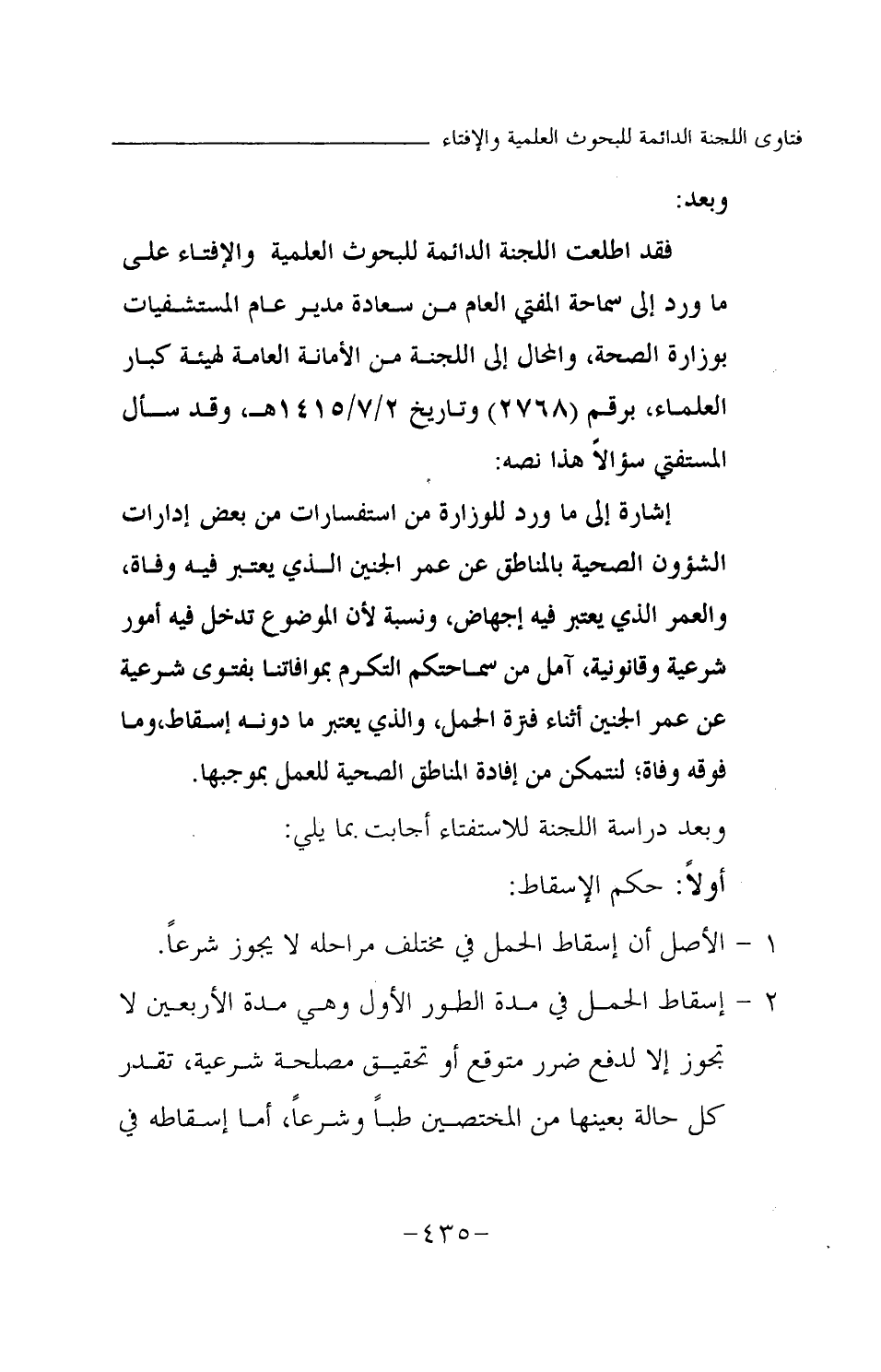 إشارة إلى ما ورد للوزارة من استفسارات من بعض إدارات الشؤون الصحية بالمناطق عن عمر الجنين الذي يعتبر فيه وفاة، والعمر الذي يعتبر فيه إجهاض، ونسبة لأن الموضوع تدخل فيه أمور شرعية وقانونية، آمل من سماحتكم التكرم بموافاتنا بفتوى شرعية عن عمر الجنين أثناء فترة الحمل، والذي يعتبر ما دونه إسقاط، وما فوقه وفاة؛ لنتمكن من إفادة المناطق الصحية للعمل بموجبها.