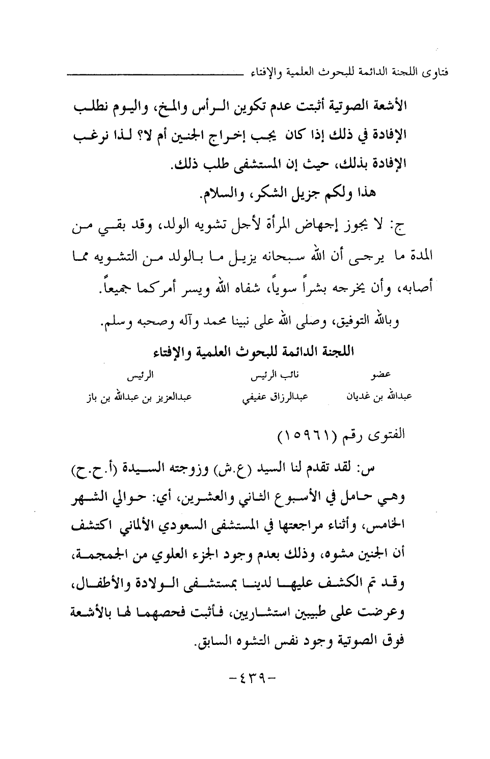 س: لقد تقدم لنا السيد (ع. ش) وزوجته السيدة (أ. ح. ح) وهي حامل في الأسبوع الثاني والعشرين، أي: حوالي الشهر الخامس، وأثناء مراجعتها في المستشفى السعودي الألماني اكتشف أن الجنين مشوه، وذلك بعدم وجود الجزء العلوي من الجمجمة، وقد تم الكشف عليها لدينا بمستشفى الولادة والأطفال، وعرضت على طبيبين استشاريين، فأثبت فحصهما لها بالأشعة فوق الصوتية وجود نفس التشوه السابق.
