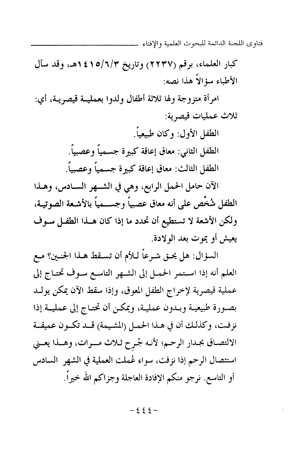 كبار العلماء، برقم (2237) وتاريخ 3 \ 6 \ 1415 هـ وقد سأل الأطباء سؤالا هذا نصه: