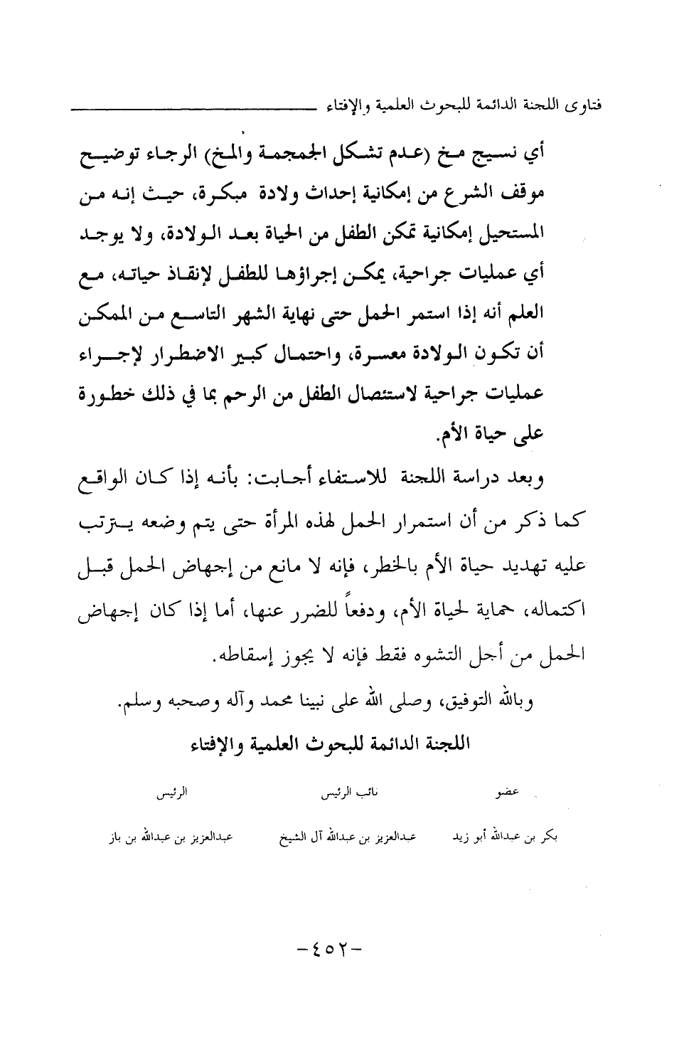 وبعد دراسة اللجنة للاستفتاء أجابت: بأنه إذا كان الواقع كما ذكر من أن استمرار الحمل لهذه المرأة حتى يتم وضعه يترتب عليه تهديد حياة الأم بالخطر، فإنه لا مانع من إجهاض الحمل قبل اكتماله، حماية لحياة الأم، ودفعا للضرر عنها، أما إذا كان إجهاض الحمل من أجل التشوه فقط فإنه لا يجوز إسقاطه.