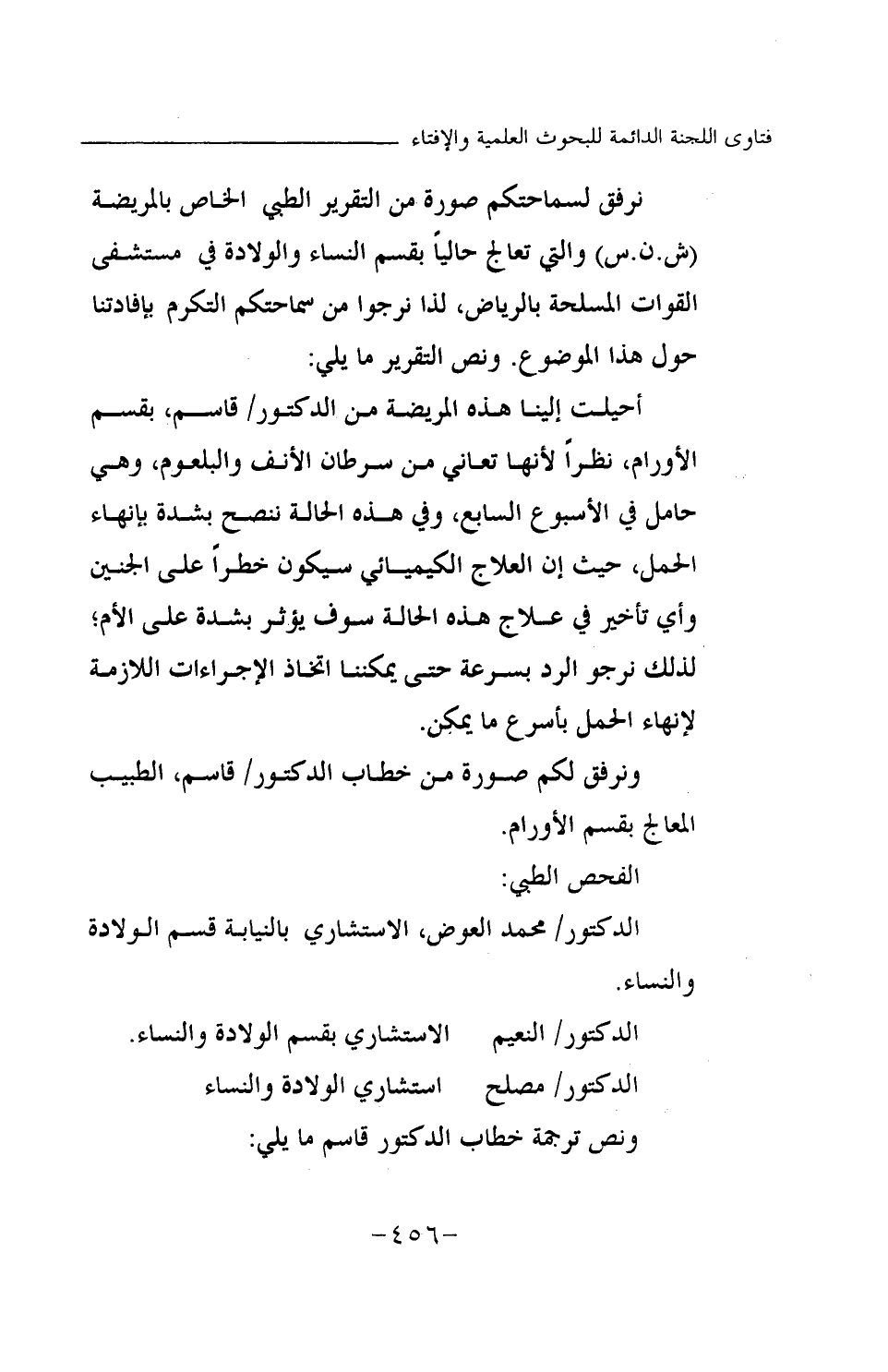 أحيلت إلينا هذه المريضة من الدكتور \ قاسم، بقسم الأورام، نظرا لأنها تعاني من سرطان الأنف والبلعوم، وهي حامل في الأسبوع السابع، وفي هذه الحالة ننصح بشدة بإنهاء الحمل، حيث إن العلاج الكيميائي سيكون خطرا على الجنين وأي تأخير في علاج هذه الحالة سوف يؤثر بشدة على الأم؛ لذلك نرجو الرد بسرعة حتى يمكننا اتخاذ الإجراءات اللازمة لإنهاء الحمل بأسرع ما يمكن.