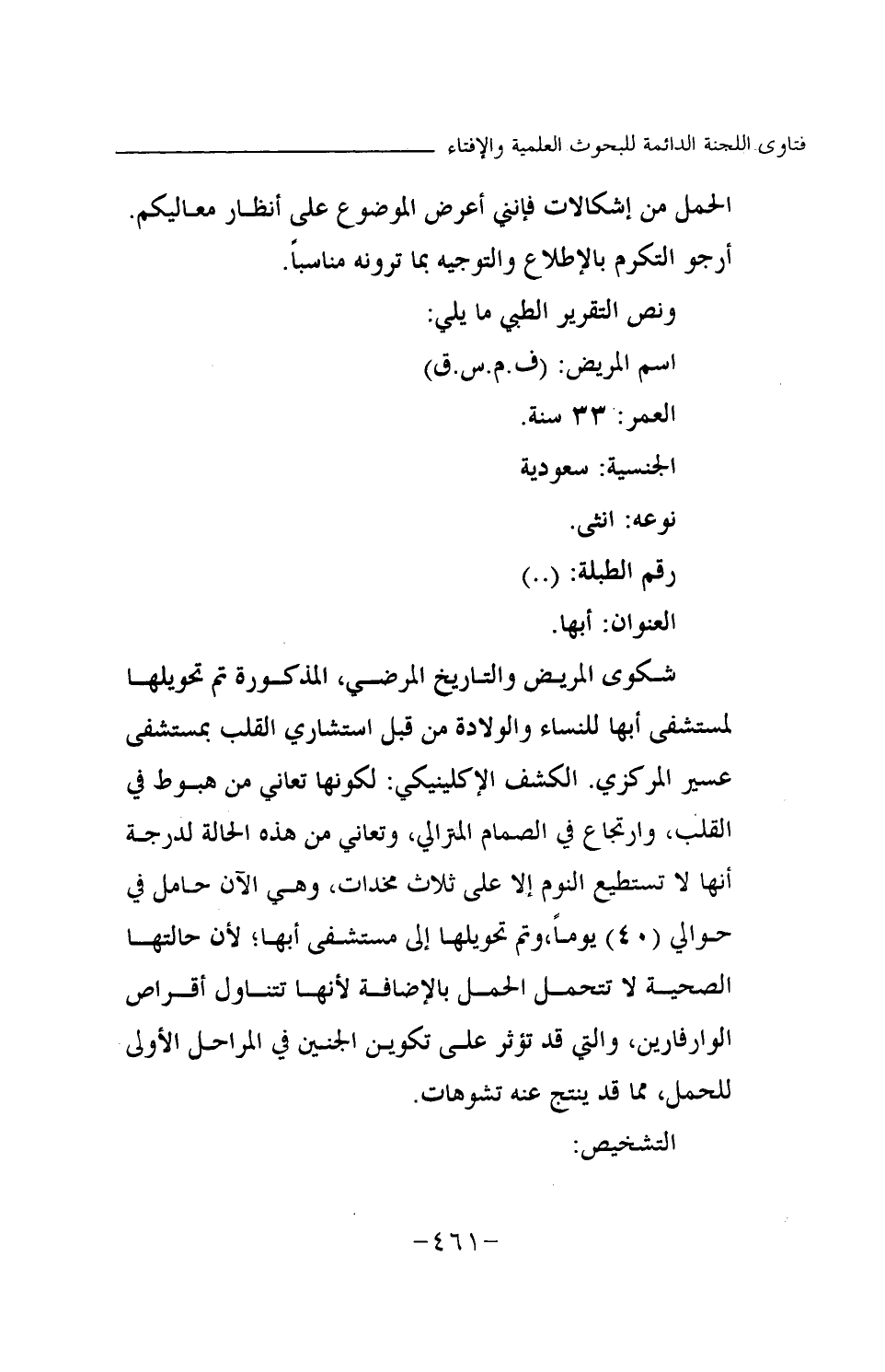 شكوى المريض والتاريخ المرضي، المذكورة تم تحويلها لمستشفى أبها للنساء والولادة من قبل استشاري القلب بمستشفى عسير المركزي. الكشف الإكلينيكي: لكونها تعاني من هبوط في القلب، وارتجاع في الصمام المترالي، وتعاني من هذه الحالة لدرجة أنها لا تستطيع النوم إلا على ثلاث مخدات، وهي الآن حامل في حوالي (40) يوما، وتم تحويلها إلى مستشفى أبها؛ لأن حالتها الصحية لا تتحمل الحمل بالإضافة لأنها تتناول أقراص الوارفارين، والتي قد تؤثر على تكوين الجنين في المراحل الأولى للحمل، مما قد ينتج عنه تشوهات.