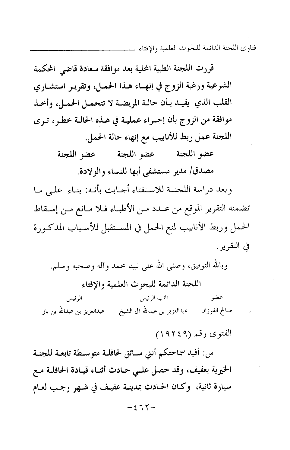 وبعد دراسة اللجنة للاستفتاء أجابت بأنه: بناء على ما تضمنه التقرير الموقع من عدد من الأطباء فلا مانع من إسقاط الحمل وربط الأنابيب لمنع الحمل في المستقبل للأسباب المذكورة في التقرير.
