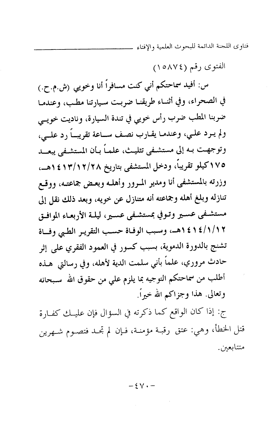 س: أفيد سماحتكم أني كنت مسافرا أنا وخويي (ش. م. ح.) في الصحراء، وفي أثناء طريقنا ضربت سيارتنا مطب، وعندما ضربنا المطب ضرب رأس خويي في تندة السيارة، وناديت خويي ولم يرد علي، وعندما يقارب نصف ساعة تقريبا رد علي، وتوجهت به إلى مستشفى تثليث، علما بأن المستشفى يبعد 175 كيلو تقريبا، ودخل المستشفى بتاريخ 28 \ 12 \ 1413 هـ وزرته بالمستشفى أنا ومدير المرور وأهله وبعض جماعته، ووقع تنازله وبلغ أهله وجماعته أنه متنازل عن خويه، وبعد ذلك نقل إلى مستشفى عسير وتوفي بمستشفى عسير، ليلة الأربعاء الموافق 12 \ 1 \ 1414هـ، وسبب الوفاة حسب التقرير الطبي وفاة تشنج بالدورة الدموية، بسبب كسور في العمود الفقري على إثر حادث مروري، علما بأني سلمت الدية لأهله، وفي رسالتي هذه أطلب من سماحتكم التوجيه بما يلزم علي من حقوق الله سبحانه وتعالى. هذا وجزاكم الله خيرا.