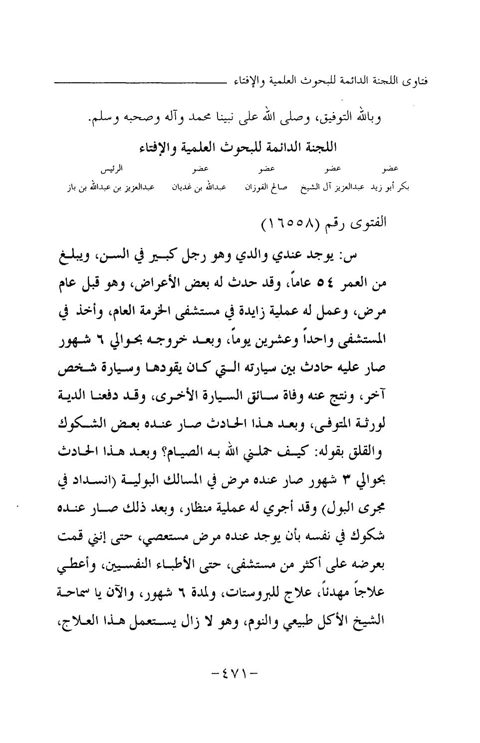 س: يوجد عندي والدي وهو رجل كبير في السن، ويبلغ من العمر 54 عاما، وقد حدت له بعض الأعراض، وهو قبل عام مرض، وعمل له عملية زايدة في مستشفى الخرمة العام، وأخذ في المستشفى واحدا وعشرين يوما، وبعد خروجه بحوالي 6 شهور صار عليه حادث بين سيارته التي كان يقودها وسيارة شخص آخر، ونتج عنه وفاة سائق السيارة الأخرى، وقد دفعنا الدية لورثة المتوفى، وبعد هذا الحادث صار عنده بعض الشكوك والقلق بقوله: كيف حملني الله به الصيام؟ وبعد هذا الحادث بحوالي 3 شهور صار عنده مرض في المسالك البولية (انسداد في مجرى البول) وقد أجري له عملية منظار، وبعد ذلك صار عنده شكوك في نفسه بأن يوجد عنده مرض مستعصي، حتى إنني قمت بعرضه على أكثر من مستشفى، حتى الأطباء النفسيين، وأعطي علاجا مهدئا، علاج للبروستات، ولمدة 6 شهور، والآن يا سماحة الشيخ الأكل طبيعي والنوم، وهو لا زال يستعمل هذا العلاج،