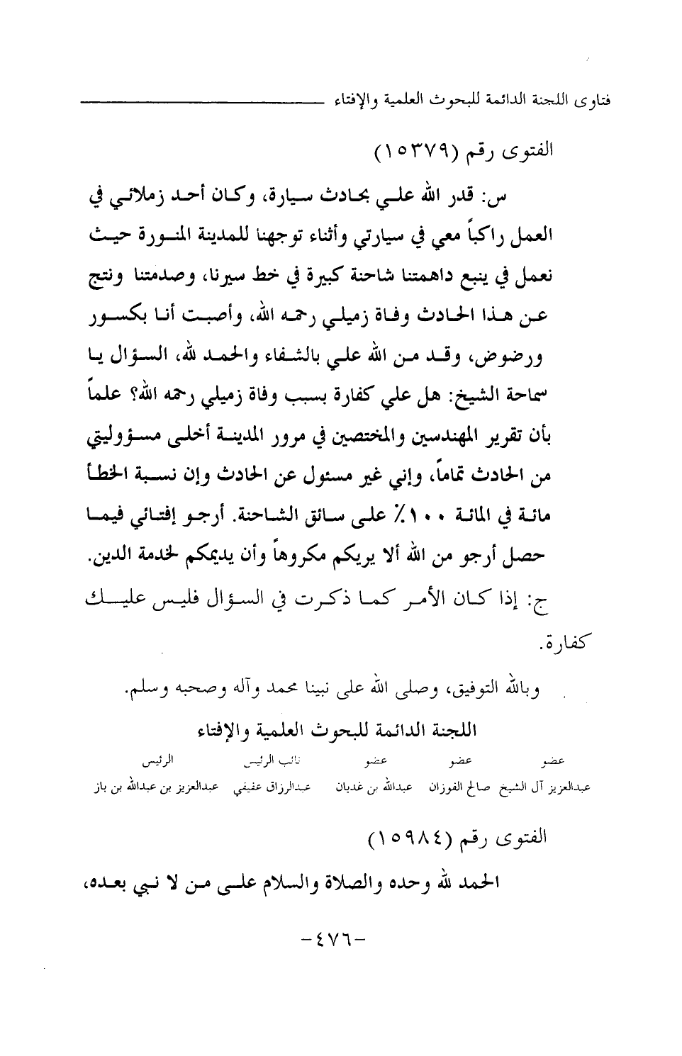 س: قدر الله علي بحادث سيارة، وكان أحد زملائي في العمل راكبا معي في سيارتي وأثناء توجهنا للمدينة المنورة حيث نعمل في ينبع داهمتنا شاحنة كبيرة في خط سيرنا، وصدمتنا ونتج عن هذا الحادث وفاة زميلي رحمه الله، وأصبت أنا بكسور ورضوض، وقد من الله علي بالشفاء والحمد لله، السؤال يا سماحة الشيخ: هل علي كفارة بسبب وفاة زميلي رحمه الله؟ علما بأن تقرير المهندسين والمختصين في مرور المدينة أخلى مسؤوليتي من الحادث تماما، وإني غير مسئول عن الحادث وإن نسبة الخطأ مائة في المائة 100% على سائق الشاحنة. أرجو إفتائي فيما حصل أرجو من الله ألا يريكم مكروها وأن يديمكم لخدمة الدين