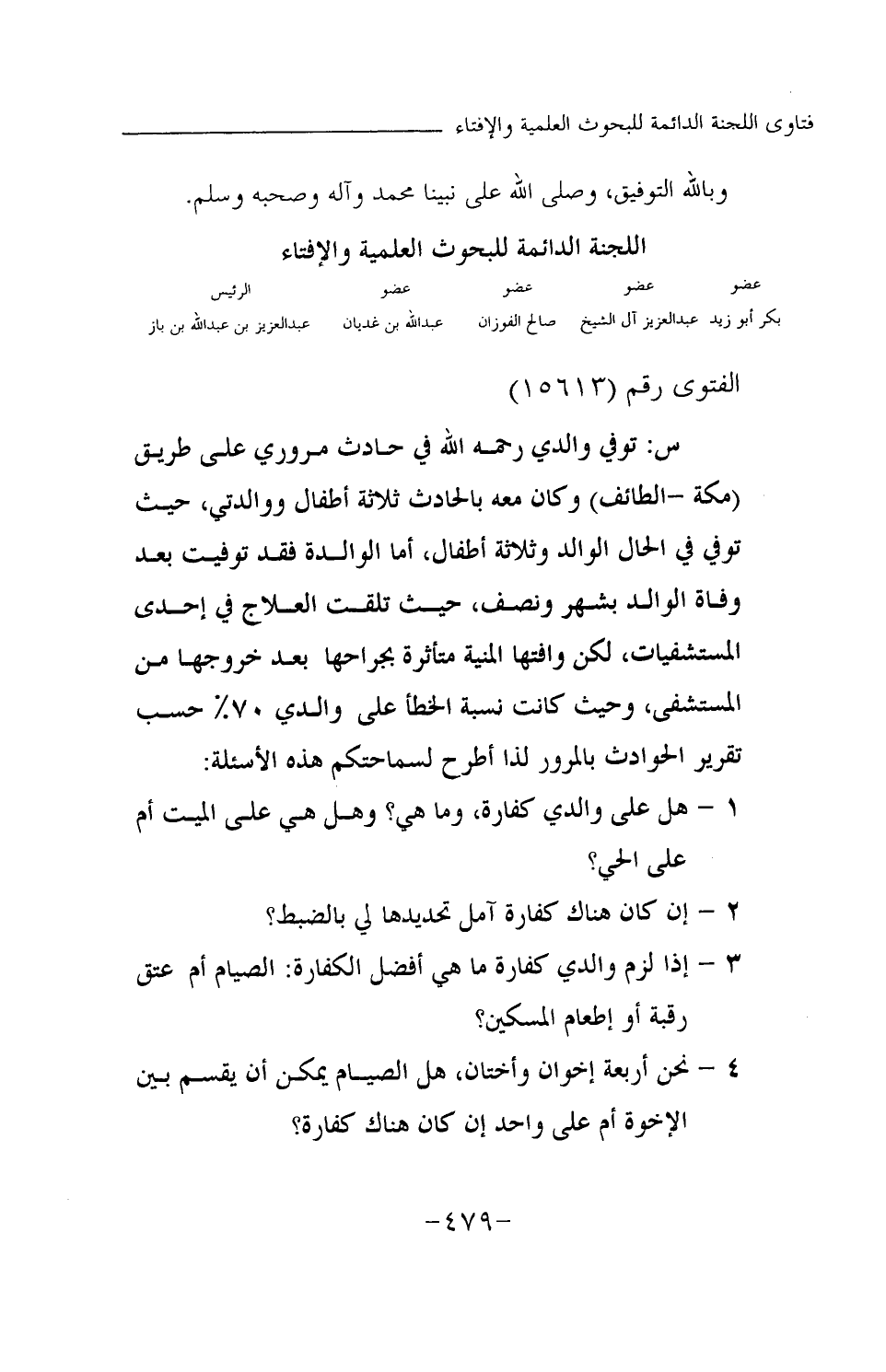 س: توفي والدي رحمه الله في حادث مروري على طريق (مكة - الطائف) وكان معه بالحادث ثلاثة أطفال ووالدتي، حيث توفي في الحال الوالد وثلاثة أطفال، أما الوالدة فقد توفيت بعد وفاة الوالد بشهر ونصف، حيث تلقت العلاج في إحدى المستشفيات، لكن وافتها المنية متأثرة بجراحها بعد خروجها من المستشفى، وحيث كانت نسبة الخطأ على والدي 70% حسب تقرير الحوادث بالمرور لذا أطرح لسماحتكم هذه الأسئلة: