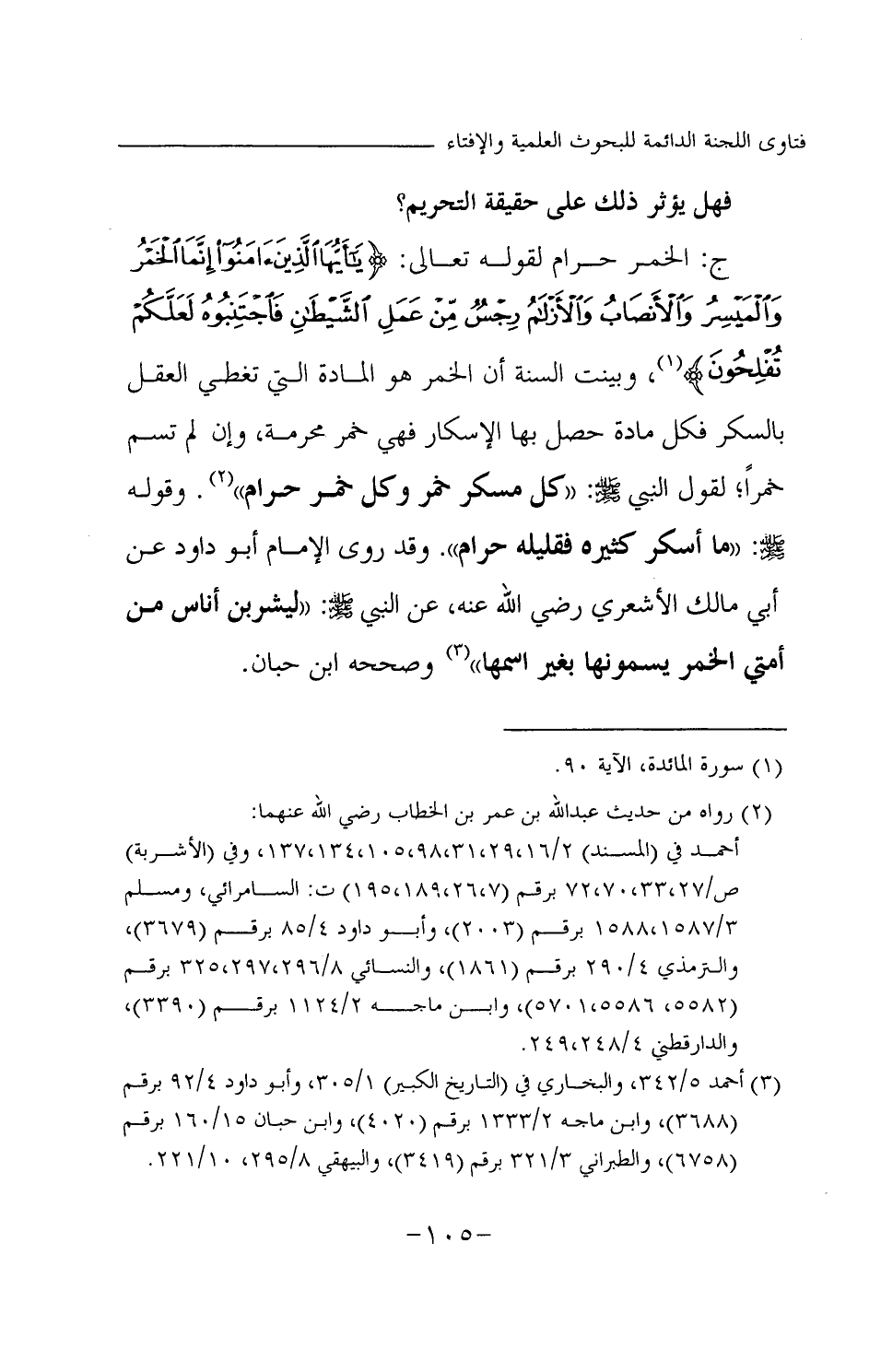 ج: الخمر حرام لقوله تعالى: {يَا أَيُّهَا الَّذِينَ آمَنُوا إِنَّمَا الْخَمْرُ وَالْمَيْسِرُ وَالأَنْصَابُ وَالأَزْلامُ رِجْسٌ مِنْ عَمَلِ الشَّيْطَانِ فَاجْتَنِبُوهُ لَعَلَّكُمْ تُفْلِحُونَ} (¬1) وبينت السنة أن الخمر هو المادة التي تغطي العقل بالسكر، فكل مادة حصل بها الإسكار فهي خمر محرمة، وإن لم تسم خمرا؟ لقول النبي - صلى الله عليه وسلم -: «كل مسكر خمر وكل خمر حرام (¬2) » وقوله - صلى الله عليه وسلم -: «ما أسكر كثيره فقليله حرام (¬3) » وقد روى الإمام أبو داود عن أبي مالك الأشعري - رضي الله عنه -، عن النبي - صلى الله عليه وسلم -: «ليشربن أناس من أمتي الخمر يسمونها بغير اسمها (¬4) » وصححه ابن حبان.