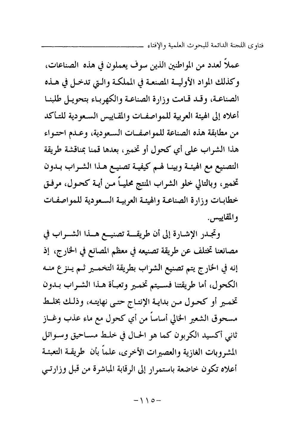 عملا لعدد من المواطنين الذين سوف يعملون في هذه الصناعات، وكذلك المواد الأولية المصنعة في المملكة والتي تدخل في هذه الصناعة، وقد قامت وزارة الصناعة والكهرباء بتحويل طلبنا أعلاه إلى الهيئة العربية للمواصفات والمقاييس السعودية للتأكد من مطابقة هذه الصناعة للمواصفات السعودية، وعدم احتواء هذا الشراب على أي كحول أو تخمير، بعدها قمنا بمناقشة طريقة التصنيع مع الهيئة وبينا لهم كيفية تصنيع هذا الشراب بدون تخمير، وبالتالي خلو الشراب المنتج محليا من أية كحول، مرفق خطابات وزارة الصناعة والهيئة العربية السعودية للمواصفات والمقاييس.