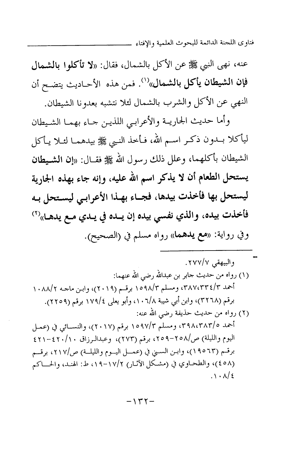 وأما حديث الجارية والأعرابي اللذين جاء بهما الشيطان ليأكلا بدون ذكر اسم الله، فأخذ النبي - صلى الله عليه وسلم - بيدهما لئلا يأكل الشيطان بأكلهما، وعلل ذلك رسول الله - صلى الله عليه وسلم - فقال: «إن الشيطان يستحل الطعام أن لا يذكر اسم الله عليه، وإنه جاء بهذه الجارية ليستحل بها فأخذت بيدها، فجاء بهذا الأعرابي ليستحل به فأخذت بيده، والذي نفسي بيده إن يده في يدي مع يدها (¬2) » وفي رواية: «مع يدهما (¬3) » رواه مسلم في (الصحيح) .