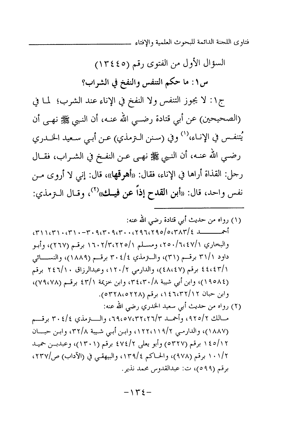 ج1: لا يجوز التنفس ولا النفخ في الإناء عند الشرب؛ لما في (الصحيحين) عن أبي قتادة - رضي الله عنه -، أن «النبي - صلى الله عليه وسلم - نهى أن يتنفس في الإناء، (¬1) » وفي (سنن الترمذي) عن أبي سعيد الخدري - رضي الله عنه -، «أن النبي - صلى الله عليه وسلم - نهى عن النفخ في الشراب، فقال رجل: القذاة أراها في الإناء، فقال: أهرقها، قال: إني لا أروى من نفس واحد، قال: أبن القدح إذا عن فيك (¬2) » وقال التزمذي: