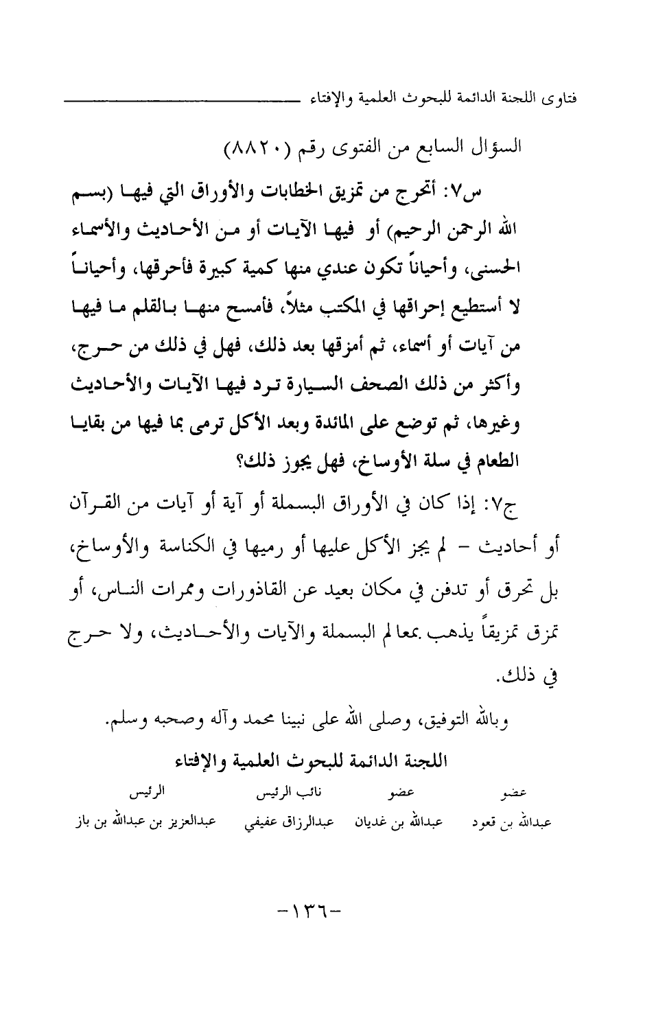 س 7: أتحرج من تمزيق الخطابات والأوراق التي فيها (بسم الله الرحمن الرحيم) أو فيها الآيات أو من الأحاديث والأسماء الحسنى، وأحيانا تكون عندي منها كمية كبيرة فأحرقها، وأحيانا لا أستطيع إحراقها في المكتب مثلا، فأمسح منها بالقلم ما فيها من آيات أو أسماء، ثم أمزقها بعد ذلك، فهل في ذلك من حرج، وأكثر من ذلك الصحف السيارة ترد فيها الآيات والأحاديث وغيرها، ثم توضع على المائدة وبعد الأكل ترمى بما فيها من بقايا الطعام في سلة الأوساخ، فهل يجوز ذلك؟