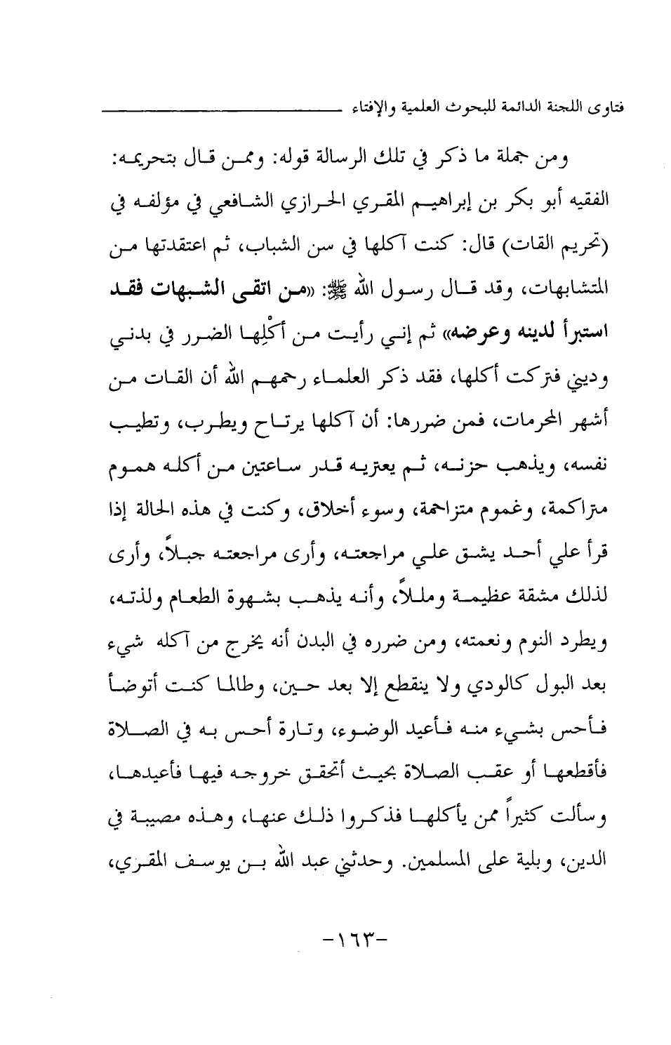 ومن جملة ما ذكر في تلك الرسالة قوله: وممن قال بتحريمه: الفقيه أبو بكر بن إبراهيم المقري الحرازي الشافعي في مؤلفه في (تحريم القات) قال: كنت آكلها في سن الشباب، ثم اعتقدتها من المتشابهات، وقد قال رسول الله - صلى الله عليه وسلم -: «من اتقى الشبهات فقد استبرأ لدينه وعرضه» ثم إني رأيت من أكلها الضرر في بدني وديني فتركت أكلها، فقد ذكر العلماء - رحمهم الله - أن القات من أشهر المحرمات، فمن ضررها: أن آكلها يرتاح ويطرب، وتطيب نفسه، ويذهب حزنه، ثم يعتريه قدر ساعتين من أكله هموم متراكمة، وغموم متزاحمة، وسوء أخلاق، وكنت في هذه الحالة إذا قرأ علي أحد يشق علي مراجعته، وأرى مراجعته جبلا، وأرى لذلك مشقة عظيمة ومللا، وأنه يذهب بشهوة الطعام ولذته، ويطرد النوم ونعمته، ومن ضرره في البدن أنه يخرج من آكله شيء بعد البول كالودي ولا ينقطع إلا بعد حين، وطالما كنت أتوضأ فأحس بشيء منه فأعيد الوضوء، وتارة أحس به في الصلاة فأقطعها أو عقب الصلاة بحيث أتحقق خروجه فيها فأعيدها، وسألت كثيرا ممن يأكلها فذكروا ذلك عنها، وهذه مصيبة في الدين، وبلية على المسلمين. وحدثني عبد الله بن يوسف المقري،