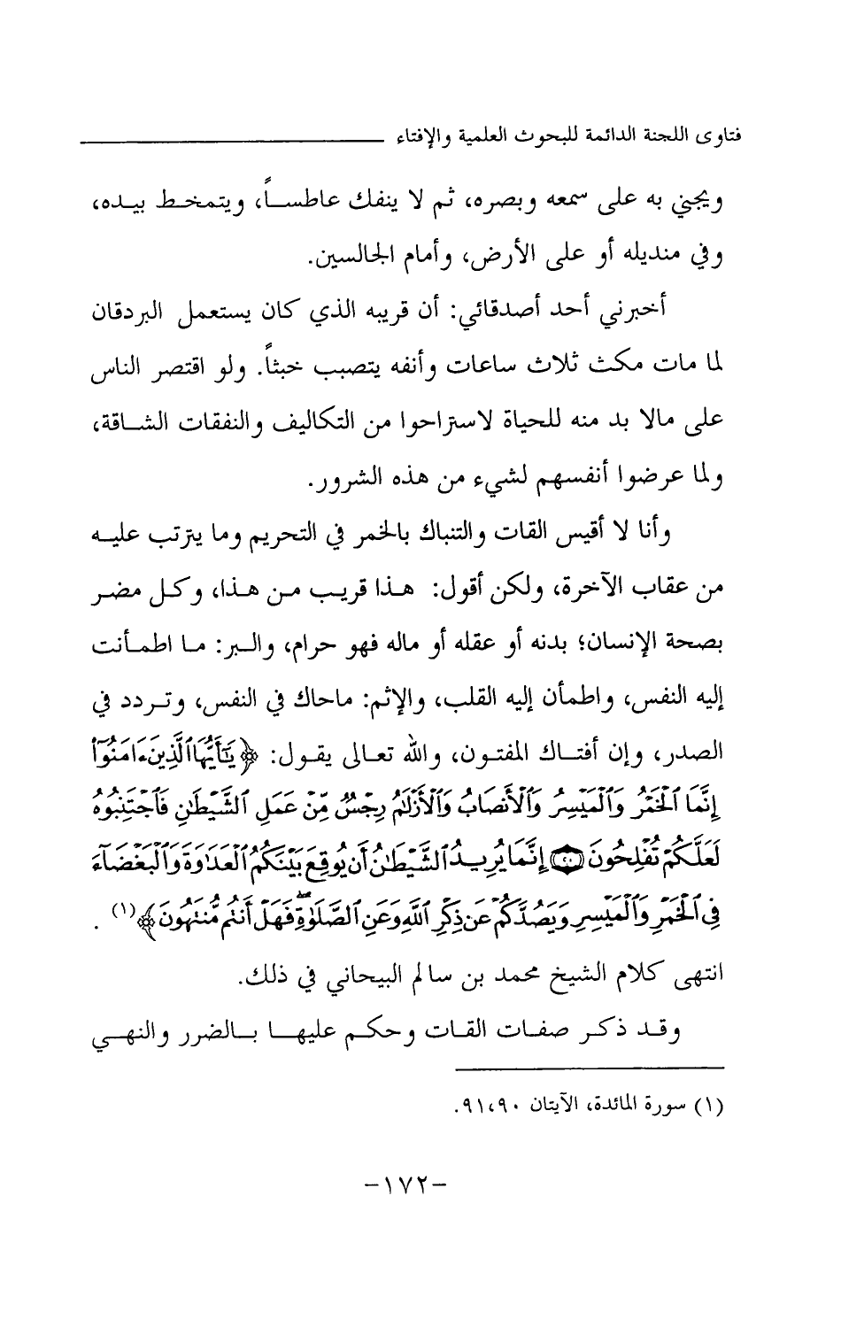 وأنا لا أقيس القات والتنباك بالخمر في التحريم وما يترتب عليه من عقاب الآخرة، ولكن أقول: هذا قريب من هذا، وكل مضر بصحة الإنسان؛ بدنه أو عقله أو ماله فهو حرام، والبر: ما اطمأنت إليه النفس، واطمأن إليه القلب، والإثم: ما حاك في النفس، وتردد في الصدر، وإن أفتاك المفتون، والله تعالى يقول: {يَا أَيُّهَا الَّذِينَ آمَنُوا إِنَّمَا الْخَمْرُ وَالْمَيْسِرُ وَالأَنْصَابُ وَالأَزْلامُ رِجْسٌ مِنْ عَمَلِ الشَّيْطَانِ فَاجْتَنِبُوهُ لَعَلَّكُمْ تُفْلِحُونَ} (¬1) {إِنَّمَا يُرِيدُ الشَّيْطَانُ أَنْ يُوقِعَ بَيْنَكُمُ الْعَدَاوَةَ وَالْبَغْضَاءَ فِي الْخَمْرِ وَالْمَيْسِرِ وَيَصُدَّكُمْ عَنْ ذِكْرِ اللَّهِ وَعَنِ الصَّلَاةِ فَهَلْ أَنْتُمْ مُنْتَهُونَ} (¬2) انتهى كلام الشيخ محمد بن سالم البيحاني في ذلك.