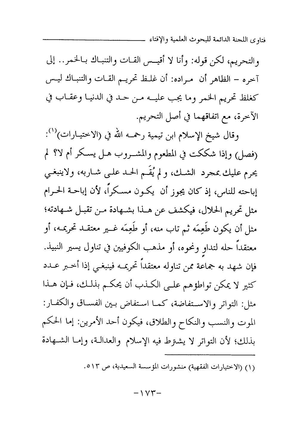 وقال شيخ الإسلام ابن تيمية - رحمه الله - في (الاختيارات) (¬1) (فصل) وإذا شككت في المطعوم والمشروب هل يسكر أم لا؟ لم يحرم عليك بمجرد الشك، ولم يقم الحد على شاربه، ولا ينبغي إباحته للناس، إذ كان يجوز أن يكون مسكرا، لأن إباحة الحرام مثل تحريم الحلال، فيكشف عن هذا بشهادة من تقبل شهادته؛ مثل أن يكون طعمه ثم تاب منه، أو طعمه غير معتقد تحريمه، أو معتقدا حله لتداو ونحوه، أو مذهب الكوفيين في تناول يسير النبيذ. فإن شهد به جماعة ممن تناوله معتقدا تحريمه فينبغي إذا أخبر عدد كثير لا يمكن تواطؤهم على الكذب أن يحكم بذلك، فإن هذا مثل: التواتر والاستفاضة، كما استفاض بين الفساق والكفار: الموت والنسب والنكاح والطلاق، فيكون أحد الأمرين: إما الحكم بذلك؛ لأن التواتر لا يشترط فيه الإسلام والعدالة، وإما الشهادة