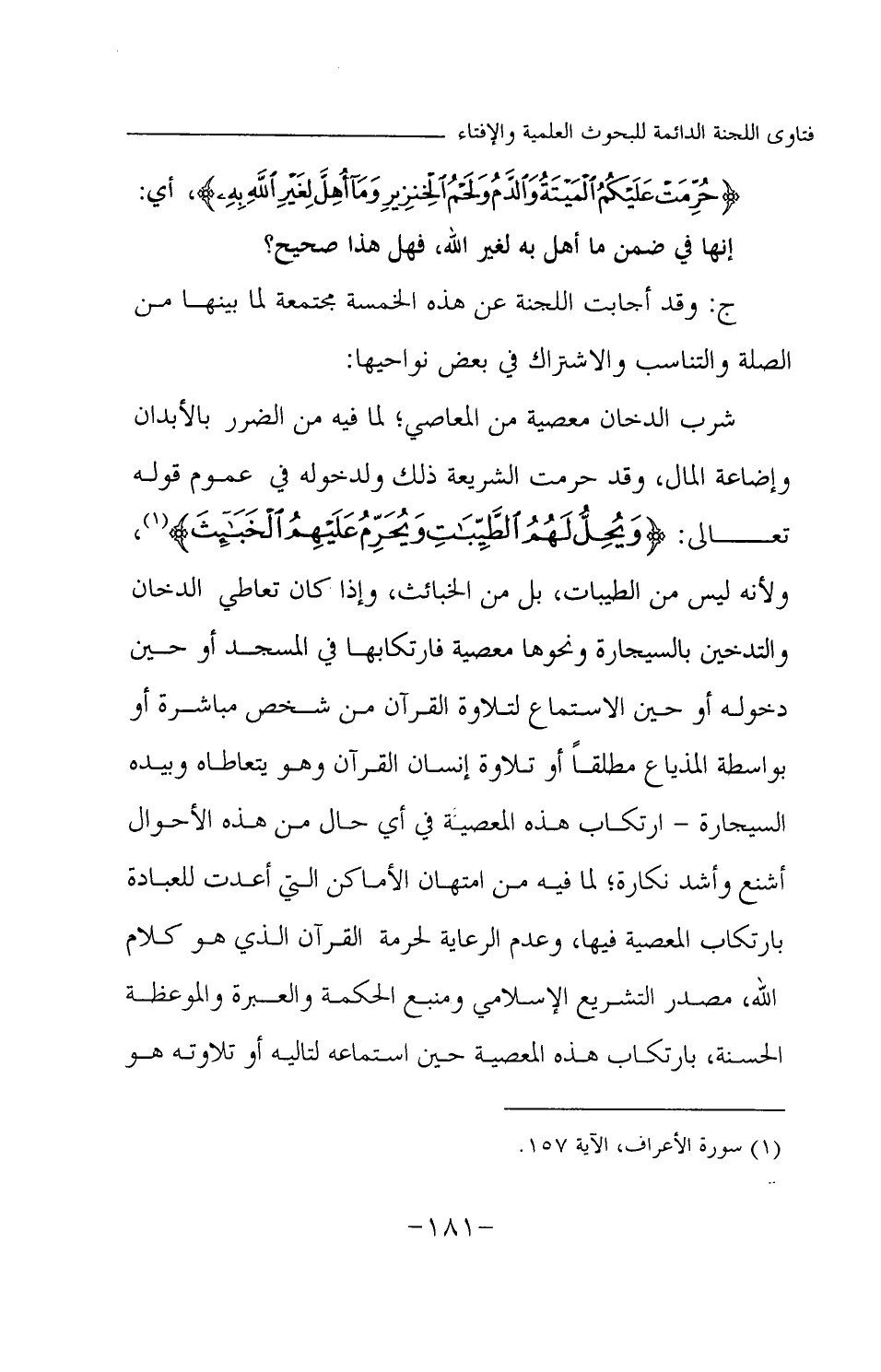 شرب الدخان معصية من المعاصي؛ لما فيه من الضرر بالأبدان وإضاعة المال، وقد حرمت الشريعة ذلك ولدخوله في عموم قوله تعالى: {وَيُحِلُّ لَهُمُ الطَّيِّبَاتِ وَيُحَرِّمُ عَلَيْهِمُ الْخَبَائِثَ} (¬2) ولأنه ليس من الطيبات، بل من الخبائث، وإذا كان تعاطي الدخان والتدخين بالسيجارة ونحوها معصية فارتكابها في المسجد أو حين دخوله أو حين الاستماع لتلاوة القرآن من شخص مباشرة أو بواسطة المذياع مطلقا أو تلاوة إنسان القرآن وهو يتعاطاه وبيده السيجارة - ارتكاب هذه المعصية في أي حال من هذه الأحوال أشنع وأشد نكارة؛ لما فيه من امتهان الأماكن التي أعدت للعبادة بارتكاب المعصية فيها، وعدم الرعاية لحرمة القرآن الذي هو كلام الله، مصدر التشريع الإسلامي ومنبع الحكمة والعبرة والموعظة الحسنة، بارتكاب هذه المعصية حين استماعه لتاليه أو تلاوته هو