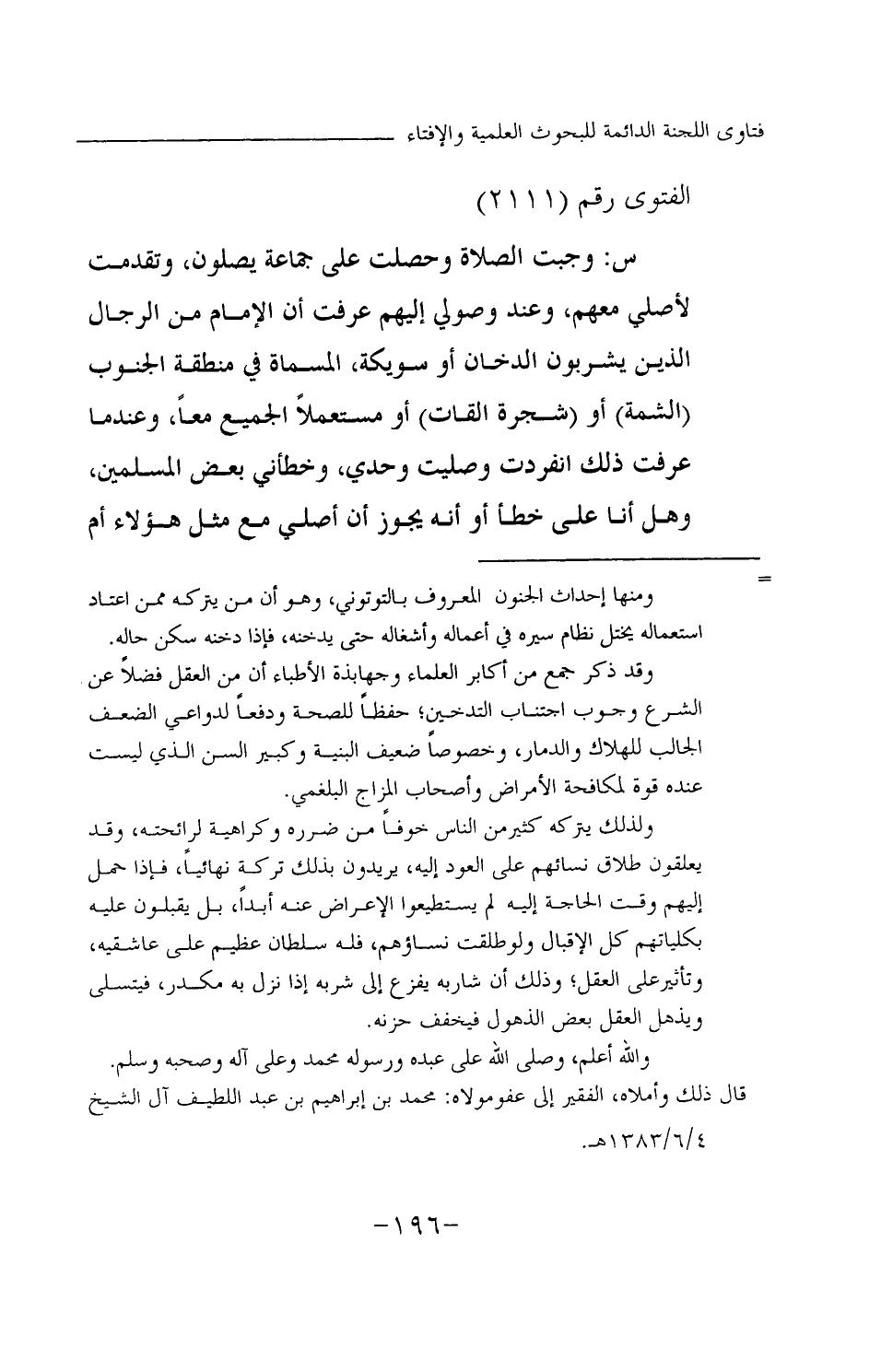س: وجبت الصلاة وحصلت على جماعة يصلون، وتقدمت لأصلي معهم، وعند وصولي إليهم عرفت أن الإمام من الرجال الذين يشربون الدخان أو سويكة، المسماة في منطقة الجنوب (الشمة) أو (شجرة القات) ، أو مستعملا الجميع معا، وعندما عرفت ذلك انفردت وصليت وحدي، وخطأني بعض المسلمين، وهل أنا على خطأ أو أنه يجوز أن أصلي مع مثل هؤلاء أم