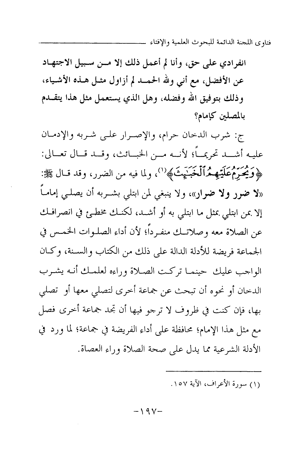 ج: شرب الدخان حرام، والإصرار على شربه والإدمان عليه أشد تحريما؛ لأنه من الخبائث، وقد قال تعالى: {وَيُحَرِّمُ عَلَيْهِمُ الْخَبَائِثَ} (¬1) ولما فيه من الضرر، وقد قال صلى الله عليه وسلم: «لا ضرر ولا ضرار (¬2) » ، ولا ينبغي لمن ابتلي بشربه أن يصلي إماما إلا بمن ابتلي بمثل ما ابتلي به أو أشد، لكنك مخطئ في انصرافك عن الصلاة معه وصلاتك منفردا؛ لأن أداء الصلوات الخمس في الجماعة فريضة للأدلة الدالة على ذلك من الكتاب والسنة.