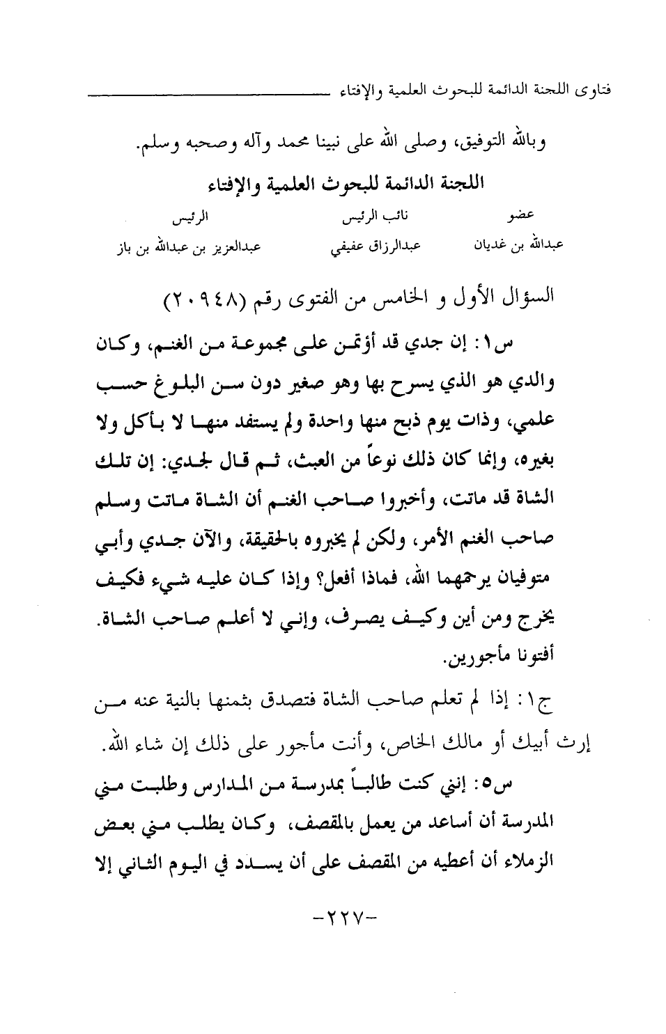 س 1: إن جدي قد أؤتمن على مجموعة من الغنم، وكان والدي هو الذي يسرح بها وهو صغير دون سن البلوغ حسب علمي، وذات يوم ذبح منها واحدة، ولم يستفد منها لا بأكل ولا بغيره، وإنما كان ذلك نوعا من العبث، ثم قال لجدي: إن تلك الشاة قد ماتت، وأخبروا صاحب الغنم أن الشاة قد ماتت، وسلم صاحب الغنم الأمر، ولكن لم يخبروه بالحقيقة، والآن جدي وأبي متوفيان يرحمهما الله، فماذا أفعل؟ وإذا كان عليه شيء فكيف يخرج؟ ومن أين وكيف يصرف؟ وإني لا أعلم صاحب الشاة. أفتونا مأجورين.