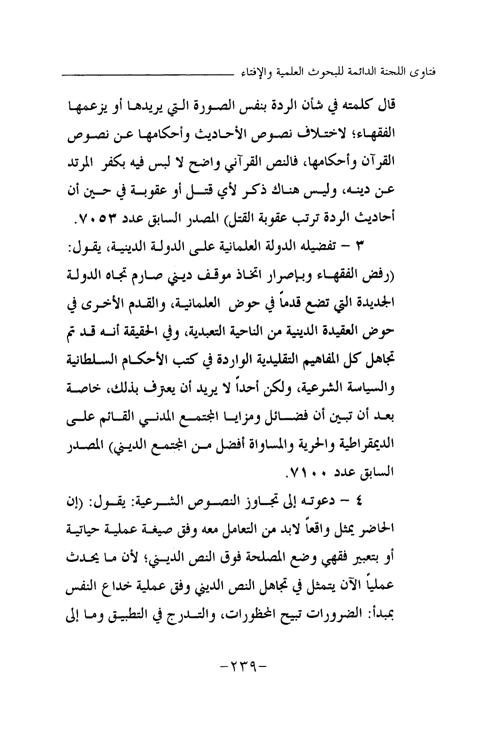 3 - تفضيله الدولة العلمانية على الدولة الدينية، يقول: (رفض الفقهاء وبإصرار اتخاذ موقف ديني صارم تجاه الدولة الجديدة التي تضع قدما في حوض العلمانية، والقدم الأخرى في حوض العقيدة الدينية من الناحية التعبدية، وفي الحقيقة أنه قد تم تجاهل كل المفاهيم التقليدية الواردة في كتب الأحكام السلطانية والسياسة الشرعية، ولكن أحدا لا يريد أن يعترف بذلك، خاصة بعد أن تبين أن فضائل ومزايا المجتمع المدني القائم على الديمقراطية والحرية والمساواة أفضل من المجتمع الديني) المصدر السابق عدد 7100.