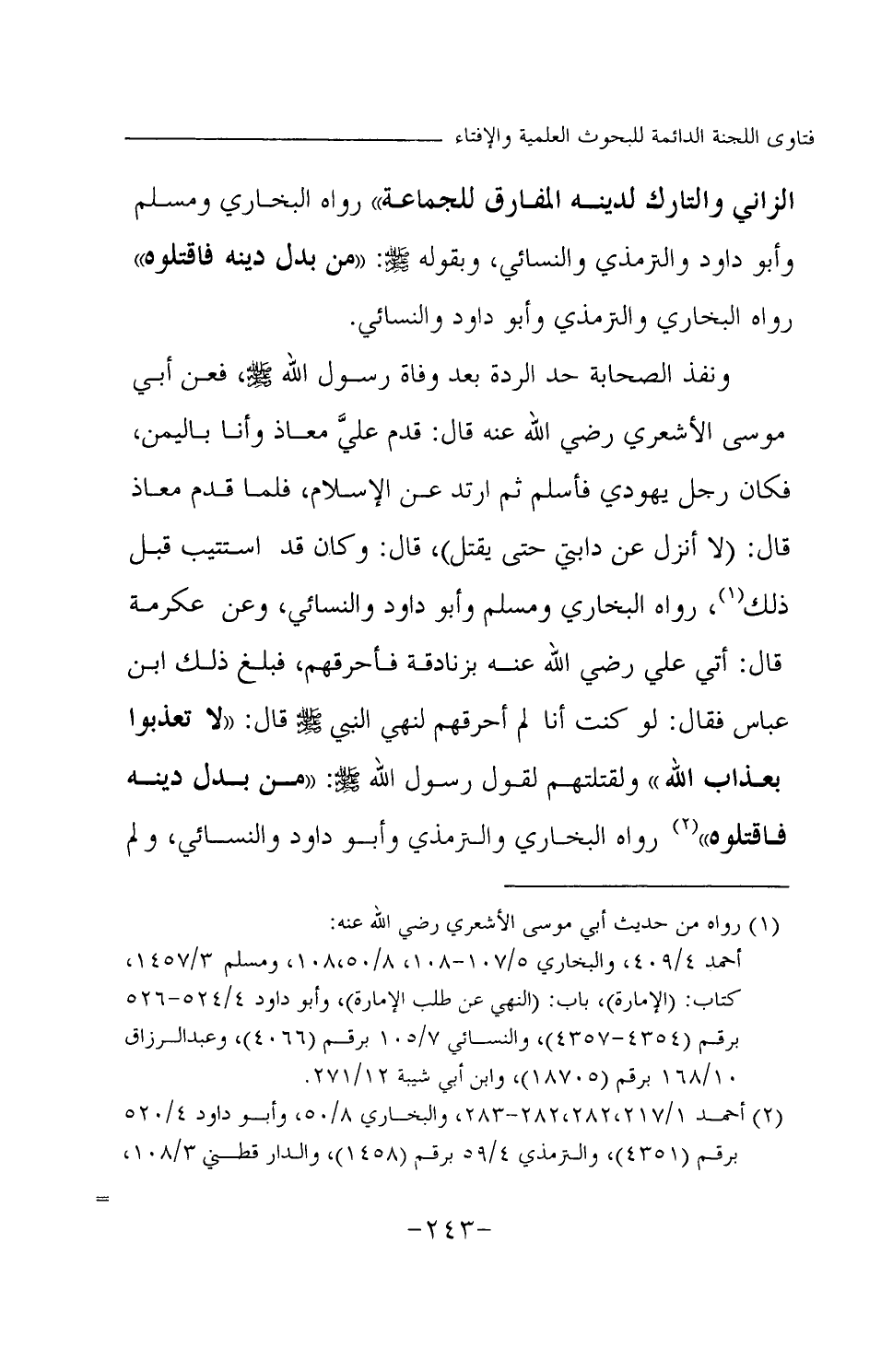 الزاني، والتارك لدينه المفارق للجماعة (¬1) » رواه البخاري ومسلم وأبو داود والترمذي والنسائي، وبقوله صلى الله عليه وسلم: «من بدل دينه فاقتلوه (¬2) » رواه البخاري والترمذي وأبو داود والنسائي.