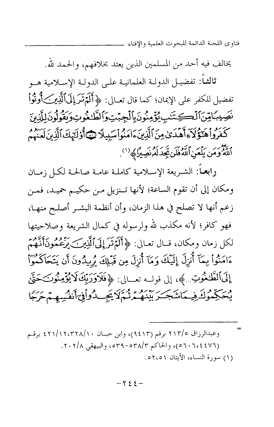 ثالثا: تفضيل الدولة العلمانية على الدولة الإسلامية هو تفضيل للكفر على الإيمان؛ كما قال تعالى: {أَلَمْ تَرَ إِلَى الَّذِينَ أُوتُوا نَصِيبًا مِنَ الْكِتَابِ يُؤْمِنُونَ بِالْجِبْتِ وَالطَّاغُوتِ وَيَقُولُونَ لِلَّذِينَ كَفَرُوا هَؤُلَاءِ أَهْدَى مِنَ الَّذِينَ آمَنُوا سَبِيلًا} (¬1) {أُولَئِكَ الَّذِينَ لَعَنَهُمُ اللَّهُ وَمَنْ يَلْعَنِ اللَّهُ فَلَنْ تَجِدَ لَهُ نَصِيرًا} (¬2)