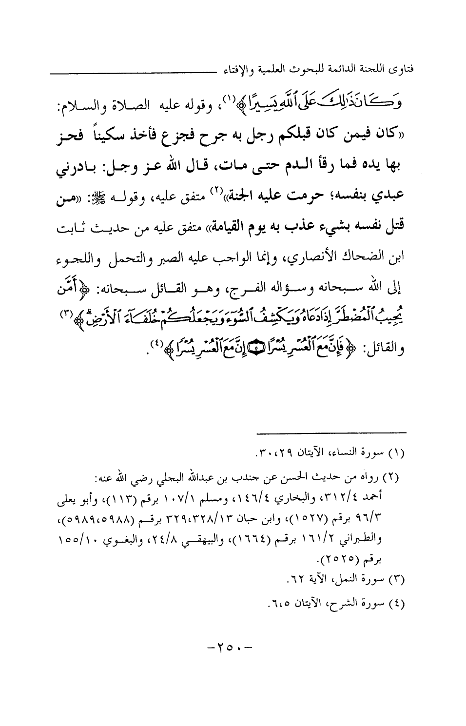 وقوله عليه الصلاة والسلام: «كان فيمن كان قبلكم رجل به جرح، فجزع فأخذ سكينا فحز بها يده، فما رقأ الدم حتى مات، قال الله عز وجل: بادرني عبدي بنفسه؛ حرمت عليه الجنة (¬1) » متفق عليه، وقوله صلى الله عليه وسلم: «من قتل نفسه بشيء عذب به يوم القيامة (¬2) » متفق عليه من حديث ثابت بن الضحاك الأنصاري، وإنما الواجب عليه الصبر والتحمل واللجوء إلى الله سبحانه، وسؤاله الفرج، وهو القائل سبحانه: {أَمَّنْ يُجِيبُ الْمُضْطَرَّ إِذَا دَعَاهُ وَيَكْشِفُ السُّوءَ وَيَجْعَلُكُمْ خُلَفَاءَ الْأَرْضِ} (¬3) والقائل: {فَإِنَّ مَعَ الْعُسْرِ يُسْرًا} (¬4) {إِنَّ مَعَ الْعُسْرِ يُسْرًا} (¬5)