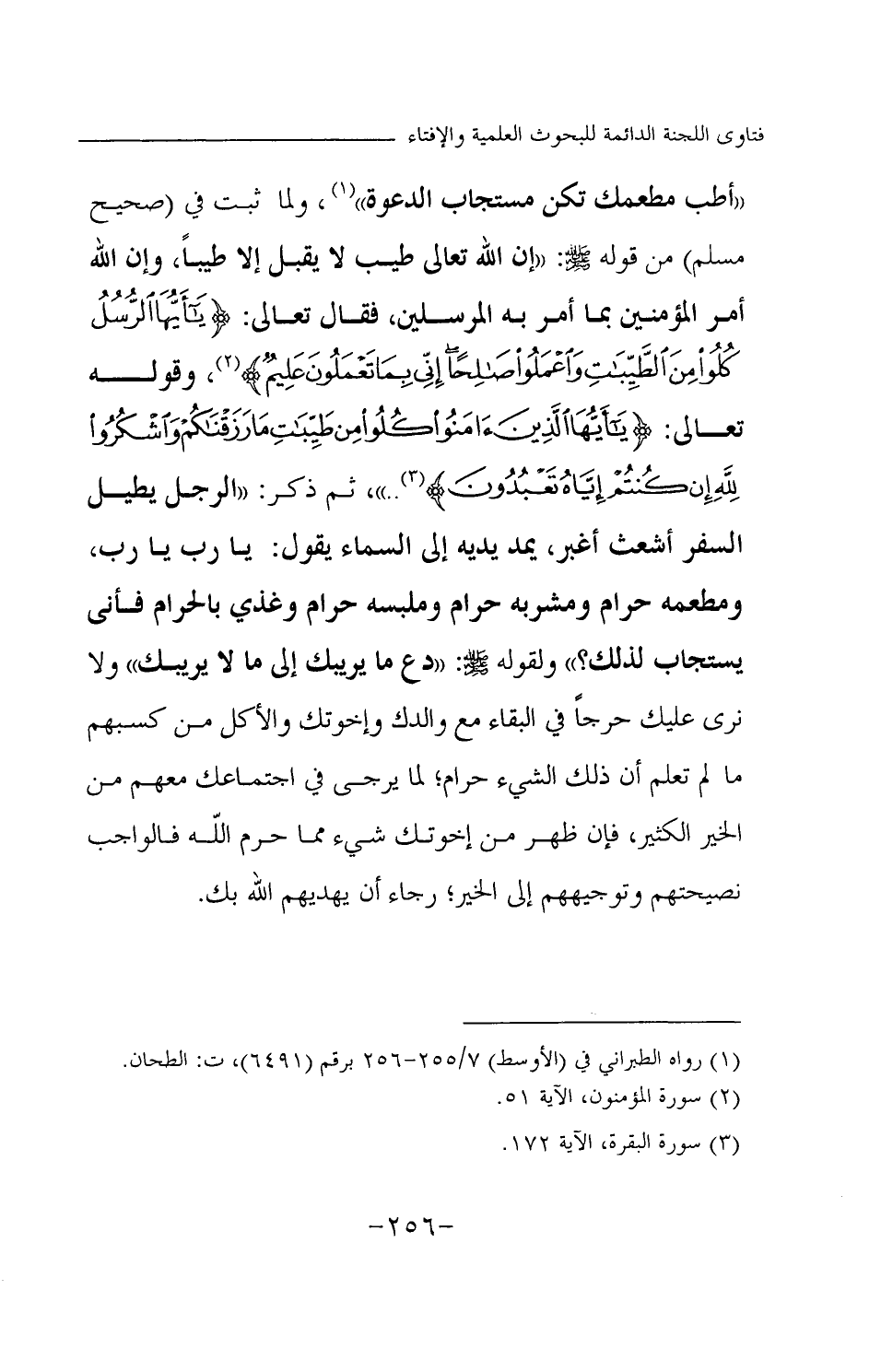 «أطب مطعمك تكن مستجاب الدعوة (¬1) » ولما ثبت في (صحيح مسلم) من قوله صلى الله عليه وسلم: «إن الله تعالى طيب لا يقبل إلا طيبا، وإن الله أمر المؤمنين بما أمر به المرسلين، فقال تعالى: وقوله تعالى: ثم ذكر: الرجل يطيل السفر أشعث أغبر، يمد يديه إلى السماء يقول: يا رب يا رب، ومطعمه حرام، ومشربه حرام، وملبسه حرام، وغذي بالحرام، فأنى يستجاب لذلك (¬4) » ؟ ، ولقوله صلى الله عليه وسلم: «دع ما يريبك إلى ما لا يريبك (¬5) » ، ولا نرى عليك حرجا في البقاء مع والدك وإخوتك، والأكل من كسبهم ما لم تعلم أن ذلك الشيء حرام؛ لما يرجى في اجتماعك معهم من الخير الكثير، فإن ظهر من إخوتك شيء مما حرم الله فالواجب نصيحتهم وتوجيههم إلى الخير؛ رجاء أن يهديهم الله بك.