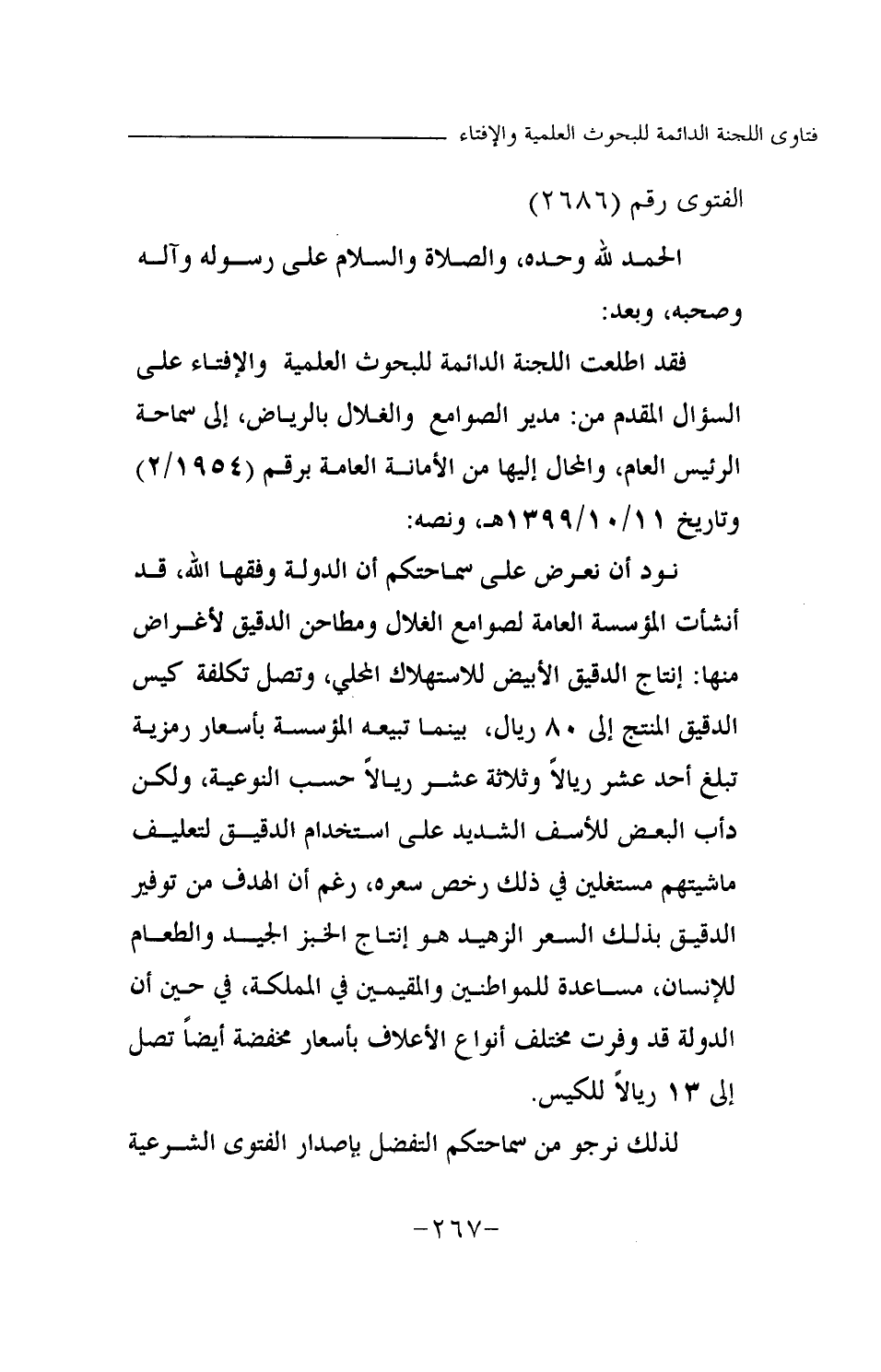 فقد اطلعت اللجنة الدائمة للبحوث العلمية والإفتاء على السؤال المقدم من: مدير الصوامع والغلال بالرياض، إلى سماحة الرئيس العام، والمحال إليها من الأمانة العامة برقم (1954 \ 2) وتاريخ 11 \ 10 \ 1399 هـ، ونصه:
