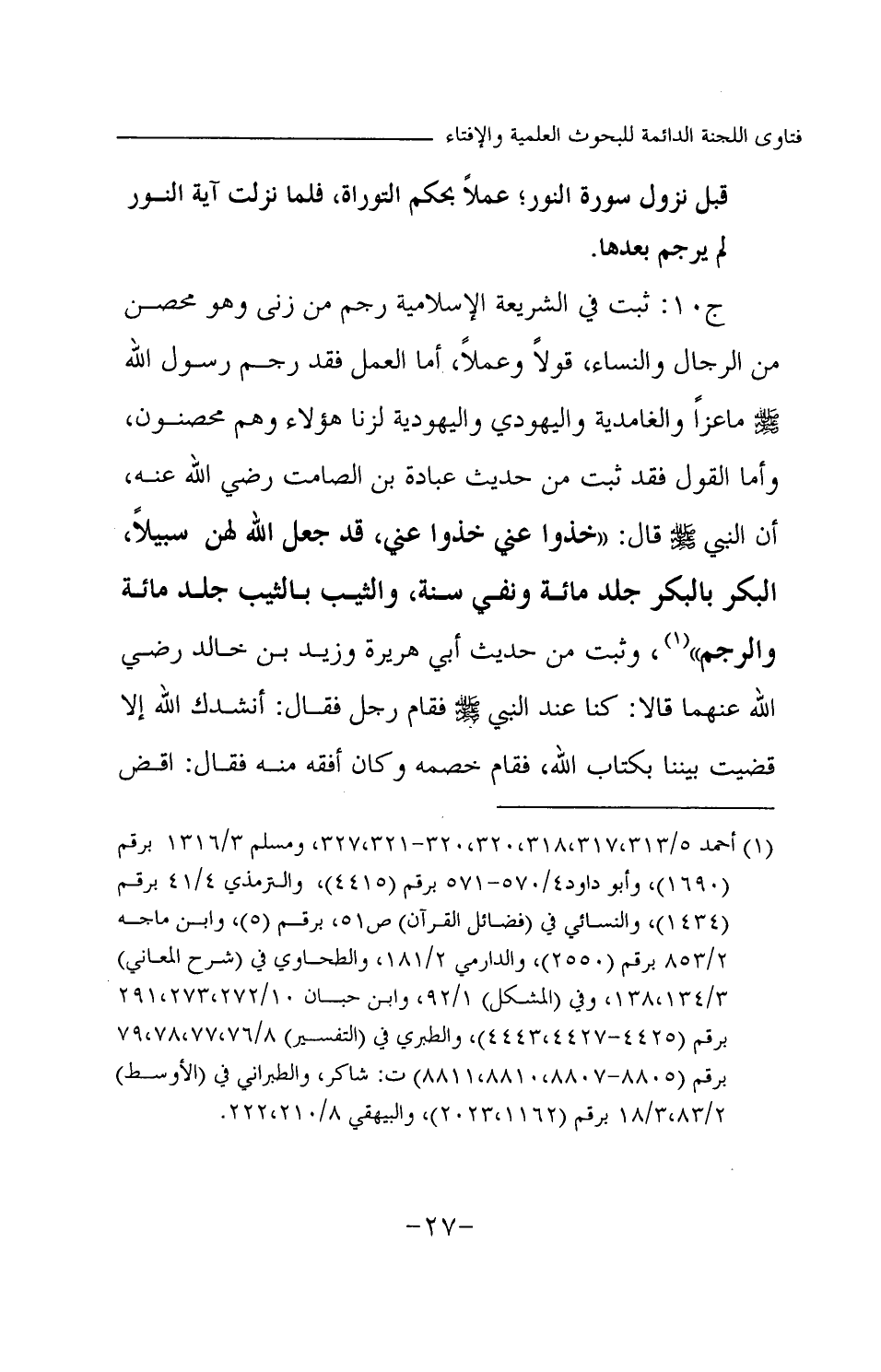 ج 10: ثبت في شريعة الإسلام رجم من زنى، وهو محصن من الرجال والنساء قولا وفعلا، أما العمل فقد رجم رسول الله - صلى الله عليه وسلم - ماعزا والغامدية واليهودي واليهودية لزنا هؤلاء وهم محصنون، وأما القول فقد ثبت من حديث عبادة بن الصامت - رضي الله عنه - أن النبي - صلى الله عليه وسلم - قال: «خذوا عني خذوا عني، قد جعل الله لهن سبيلا، البكر بالبكر جلد مائة ونفي سنة، والثيب جلد مائة والرجم (¬1) » وثبت من حديث أبي هريرة وزيد بن خالد - رضي الله عنهما - قالا: «كنا عند النبي - صلى الله عليه وسلم - فقام رجل فقال: أنشدك الله إلا قضيت بيننا بكتاب الله، فقام خصمه وكان أفقه منه فقال: اقض