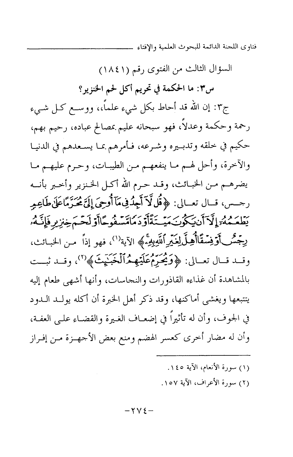ج 3: إن الله قد أحاط بكل شيء علما، ووسع كل شيء رحمة وحكمة وعدلا، فهو سبحانه عليم بمصالح عباده، رحيم بهم، حكيم في خلقه وتدبيره وشرعه، فأمرهم بما يسعدهم في الدنيا والآخرة، وأحل لهم ما ينفعهم من الطيبات، وحرم عليهم ما يضرهم من الخبائث، وقد حرم الله أكل الخنزير وأخبر بأنه رجس، قال تعالى: {قُلْ لَا أَجِدُ فِي مَا أُوحِيَ إِلَيَّ مُحَرَّمًا عَلَى طَاعِمٍ يَطْعَمُهُ إِلَّا أَنْ يَكُونَ مَيْتَةً أَوْ دَمًا مَسْفُوحًا أَوْ لَحْمَ خِنْزِيرٍ فَإِنَّهُ رِجْسٌ أَوْ فِسْقًا أُهِلَّ لِغَيْرِ اللَّهِ بِهِ} (¬1) الآية فهو إذا من الخبائث، وقد قال تعالى: {وَيُحَرِّمُ عَلَيْهِمُ الْخَبَائِثَ} (¬2) وقد ثبت بالمشاهدة أن غذاءه القاذورات والنجاسات، وأنها أشهى طعام إليه يتتبعها ويغشى أماكنها، وقد ذكر أهل الخبرة أن أكله يولد الدود في الجوف، وأن له تأثيرا في إضعاف الغيرة والقضاء على العفة، وأن له مضار أخرى كعسر الهضم ومنع بعض الأجهزة من إفراز