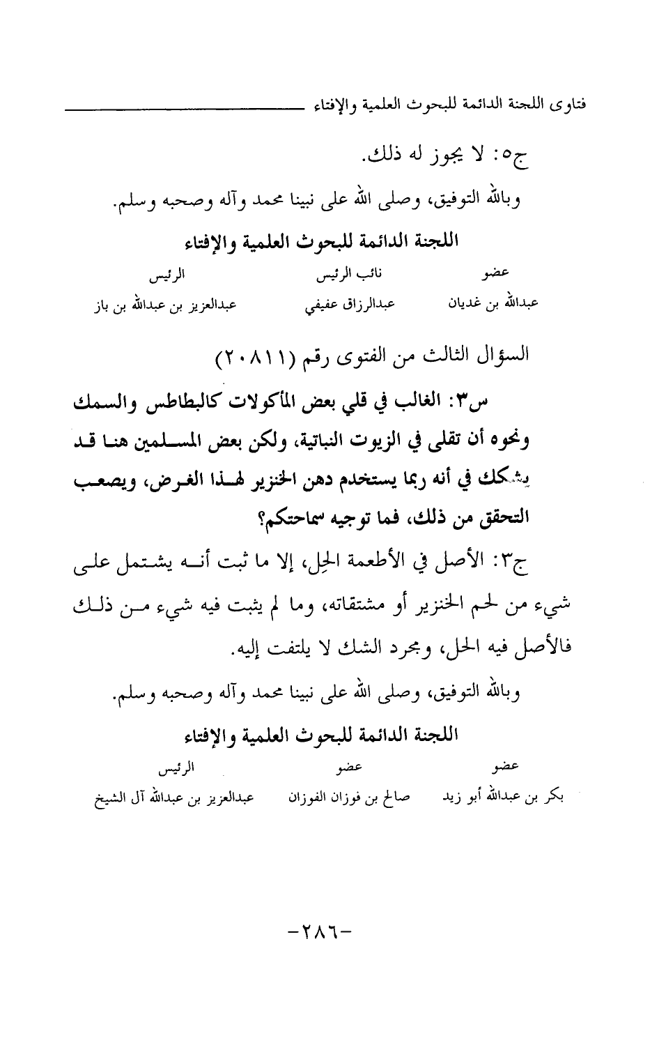 س 3: الغالب في قلي بعض المأكولات، كالبطاطس والسمك ونحوه أن تقلى في الزيوت النباتية، ولكن بعض المسلمين هنا قد يشكك في أنه ربما يستخدم دهن الخنزير لهذا الغرض، ويصعب التحقق من ذلك، فما توجيه سماحتكم؟