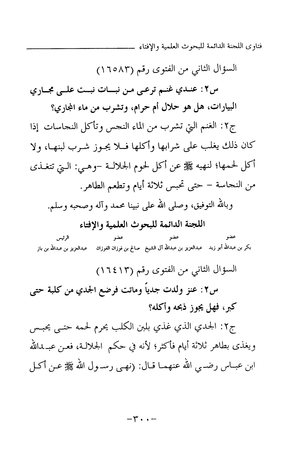 ج 2: الغنم التي تشرب من الماء النجس وتأكل النجاسات إذا كان ذلك يغلب على شرابها وأكلها فلا يجوز شرب لبنها، ولا أكل لحمها؛ «لنهيه صلى الله عليه وسلم عن أكل لحوم الجلالة (¬1) » - وهي: التي تتغذى من النجاسة - حتى تحبس ثلاثة أيام وتطعم الطاهر.
